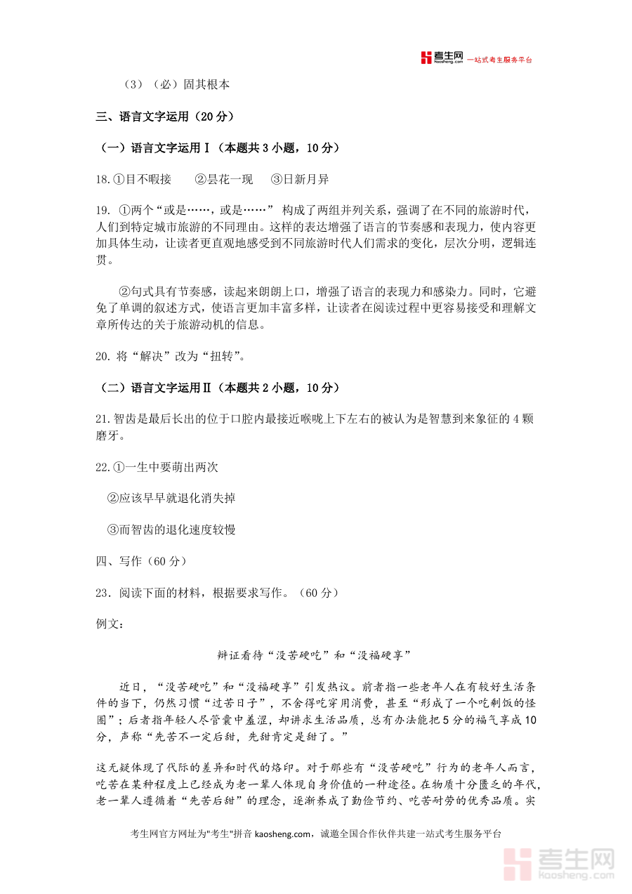 该资料主要用于高三学生在模拟测试后核对答案并理解解题思路——学生可通过对比自身作答与解析中的得分要点明确知识盲区;教师可将其作为备课参考,提取典型例题及解析逻辑设计教学方案;自主复习场景下使用者能借助各模块解析掌握新高考题型规律(如语言文字运用中的句式优化技巧),从而提升应试能力。其备考优势在于不仅提供标准答案,更通过分层解析引导使用者构建答题思维框架,例如写作部分结合“没苦硬吃”与“没福硬享”的例文分析,帮助学生学会从辩证角度立意,增强作文深度与逻辑性。