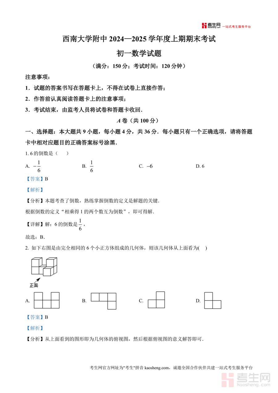 《精品解析:重庆市西南大学附属中学校2024—-2025学年七年级上学期期末数学试题(解析版).docx》是一份针对七年级上学期数学期末备考设计 的权威真题解析资料,涵盖该校期末试题A卷(满分100分)与B卷(满分50分)全题型内容。资料系统解析了选择题中的代数基础(如倒数定义、代数式书写规范)、几何图形(三视图、方位角计算)、应用题(相遇问题建模)等核心考点;填空题涉及科学记数法、补角余角关系、同解方程等知识点;解答题包含有理数混合运算、整式化简、一元一次方程求解、线段中点计算及几何证明等题型。特色亮点在于每道题均配备详细分析思路、步骤拆解及易错点提示,并结合该校教学特色提炼命题规律,为学生提供精准解题指导。