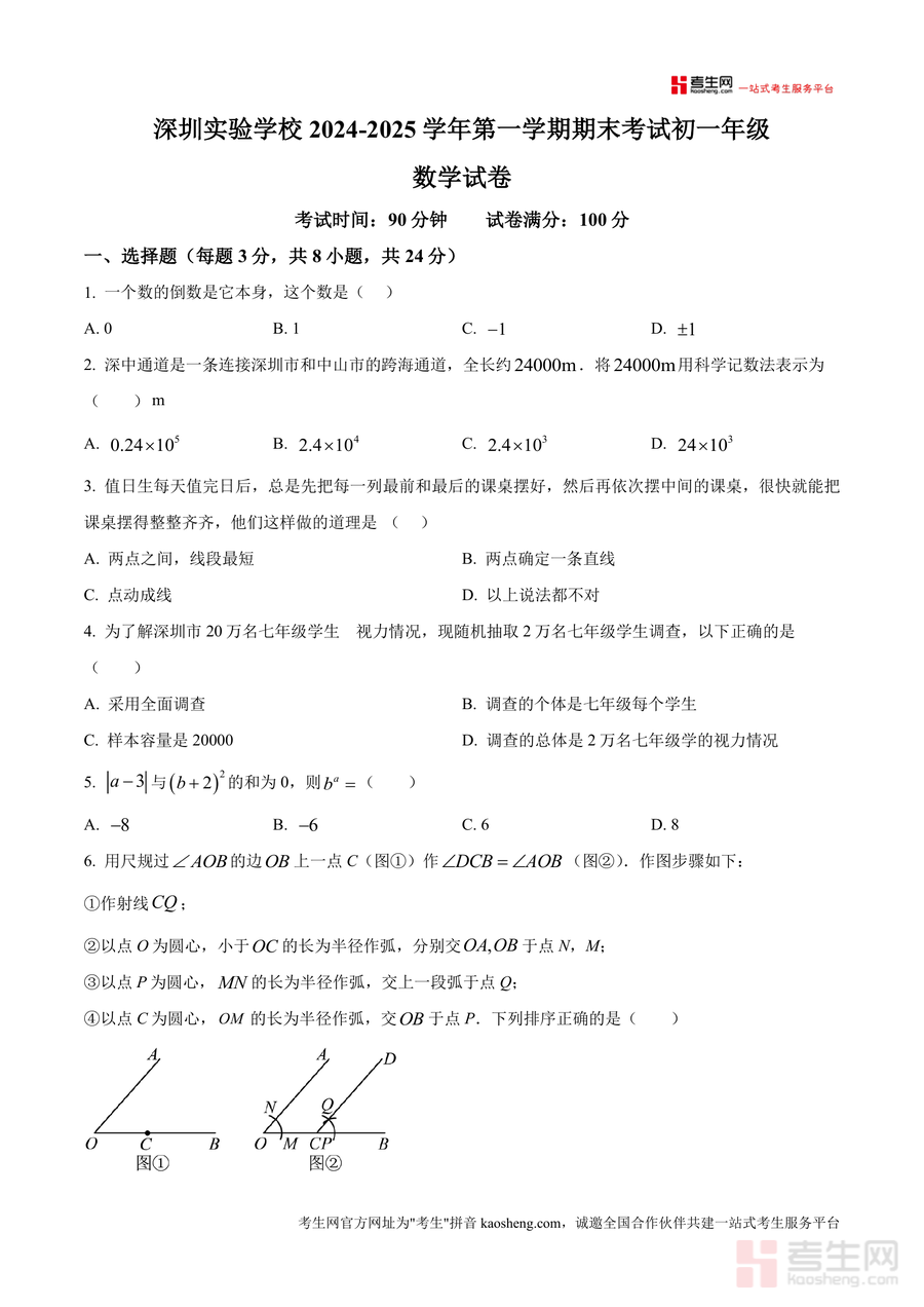 《精品解析:广东省深圳实验学校初中部2024-2025学年上学期七年级期末数学试卷(原卷版).docx》是一份聚焦七年级数学期末备考需求的优质真题资料,涵盖选择题、填空题及解答题三大题型共七道大题61分分值,内容覆盖有理数运算、几何图形性质、统计图表分析、方程应用等七年级上册核心知识点。其特色亮点在于依托深圳实验学校优质教学资源编制而成,题目设计既注重基础概念的精准考查,又融入知识综合应用与创新思维培养元素,题型分布与分值设置严格贴合本地期末考纲要求。