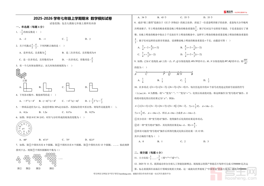 《2025-2026学年七年级上学期期末数学模拟试卷-重庆适用.docx》是一份针对重庆地区七年级学生设计的期末备考专用模拟资料。该试卷全面覆盖人教版七年级上册所有核心知识点(含有理数运算、代数式化简求值、一元一次方程应用、几何图形初步及新定义题型等),题型设置严格贴合重庆本地期末考命题结构:单选题10题、填空题8题、解答题8题(含计算、化简求值、应用题、几何探究等)。其特色亮点在于融入重庆本地场景(如网络购物销售问题)及创新题型设计(如"何方神数"新定义题、"相生角"几何探究题),能帮助学生熟悉本地考试题型与难度梯度,精准对接备考需求。