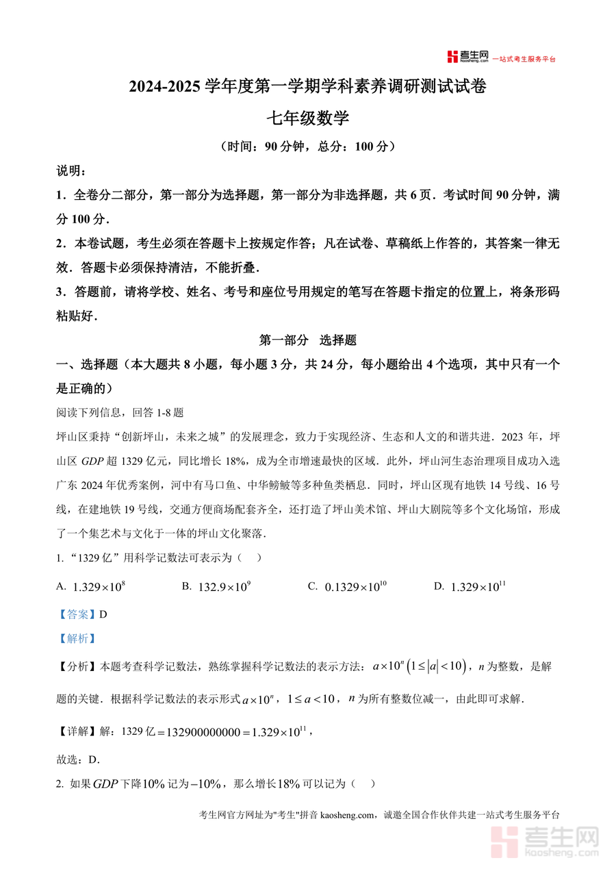 《精品解析:广东省深圳市坪山区2024-2025学年七年级上学期期末考试数学试题(解析版).docx》是一份针对坪山区七年级数学期末备考设计的数据化备考资料,涵盖试卷原题及全题型深度解析。资料严格遵循本地考试说明,包含选择题(8小题)、填空题(5小题)及解答题(7小题)三大模块共61分分值内容;每道题目均配备精准考点分析(如科学记数法、正负数应用)、步骤化详解及易错点提示,且融入坪山区GDP数据、地铁建设、美术馆等区域特色素材作为命题情境,既贴合本地教学实际,又强化知识点与生活场景关联。其特色亮点在于分层解析体系,基础题侧重概念巩固,综合题突出逻辑推导与解题方法迁移,助力学生精准把握考点要求。
