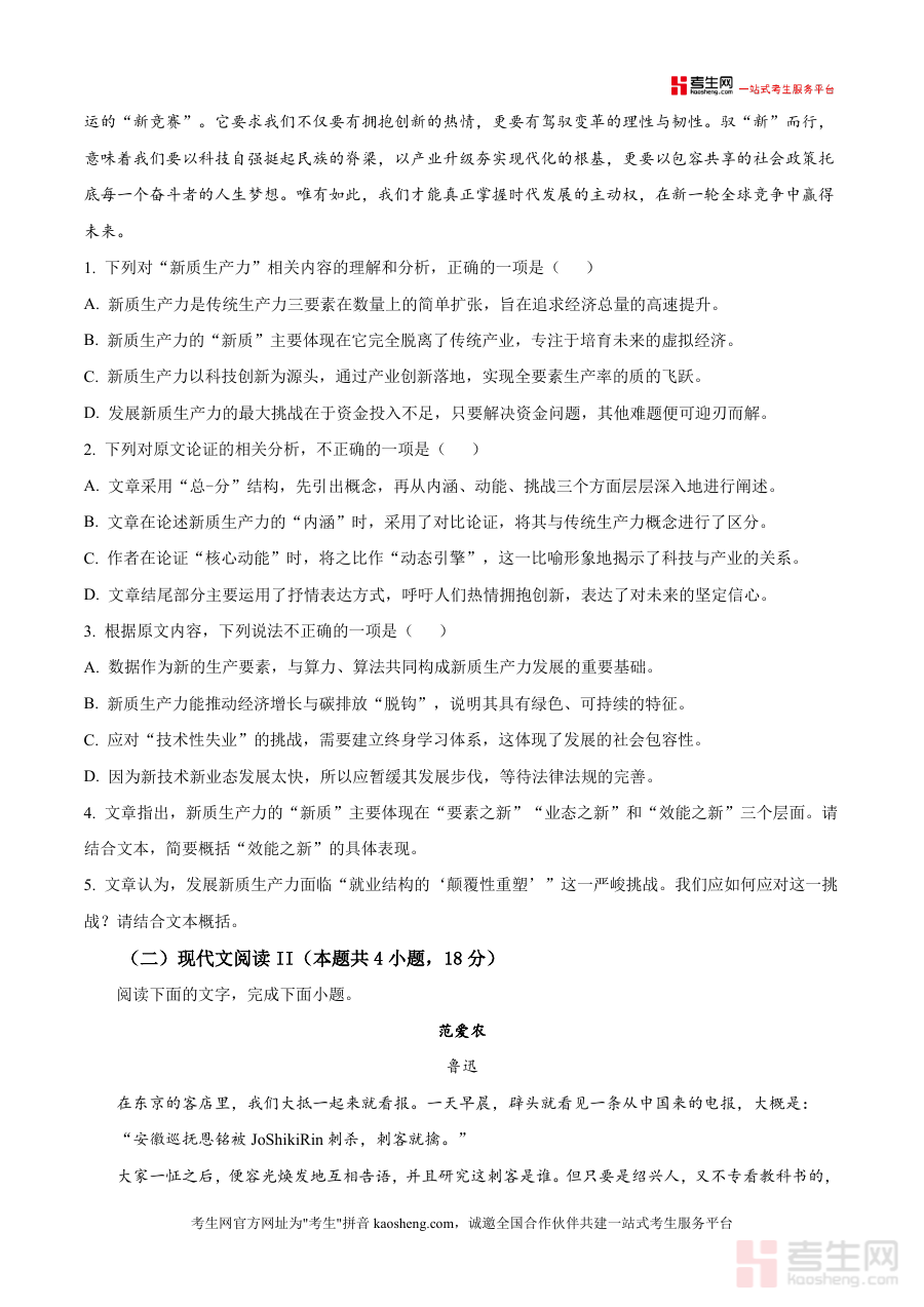 《精品解析:2026届四川省泸州市叙永第一中学校高三一模语文试题(原卷版).docx》是一份针对高三学生语文备考需求设计制作,紧密贴合高考命题趋势的优质模拟试题资源。该资料完整呈现高三一模语文考试原卷内容,包含现代文阅读(分为论述类文本阅读和文学类文本阅读)等核心题型,全面覆盖高考语文考查要点;其特色亮点在于融入当下社会热点话题如"新质生产力"等内容,同时选用鲁迅经典作品《范爱农》作为文学类阅读材料,既注重考查学生对前沿概念理解能力,又强化对经典文学作品分析鉴赏能力培养,能够有效检测学生语文综合素养与知识应用水平,为后续复习提供精准参考依据。