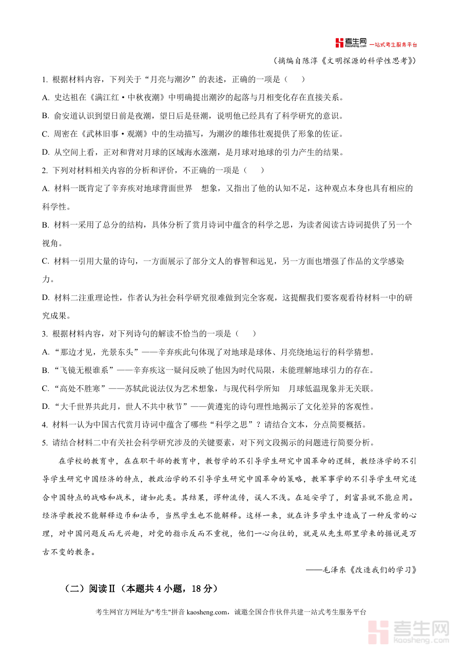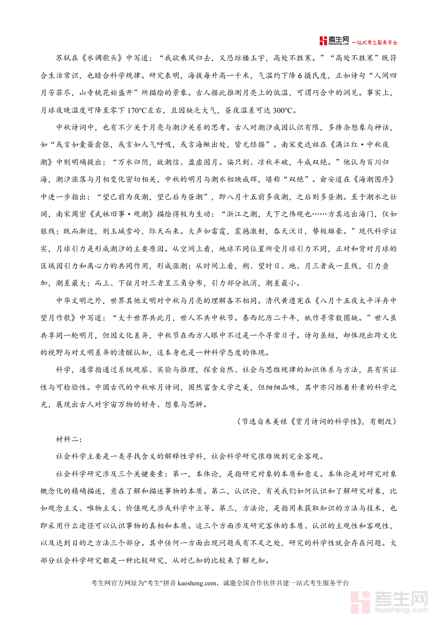 《精品解析:2026届四川省泸州市高三一模语文试题(原卷版).docx》是一份面向2026届泸州市高三学生设计的松威诊断性考试资料,核心内容覆盖高考语文全题型模块(含阅读Ⅰ、阅读Ⅱ等72分阅读板块及规范答题要求),特色亮点在于文本选材兼具学科交叉性与人文深度:材料一以古典赏月诗词为载体,挖掘其中蕴含的科学思维(如月球绕地运行猜想、潮汐与月相关系等),材料二聚焦社会科学研究三要素(本体论、认识论、方法论),材料三通过老年痴呆主题文学文本展现情感与现实关联,为考生提供真实且多元的松威考试内容场景,是高质量备考资料之一?