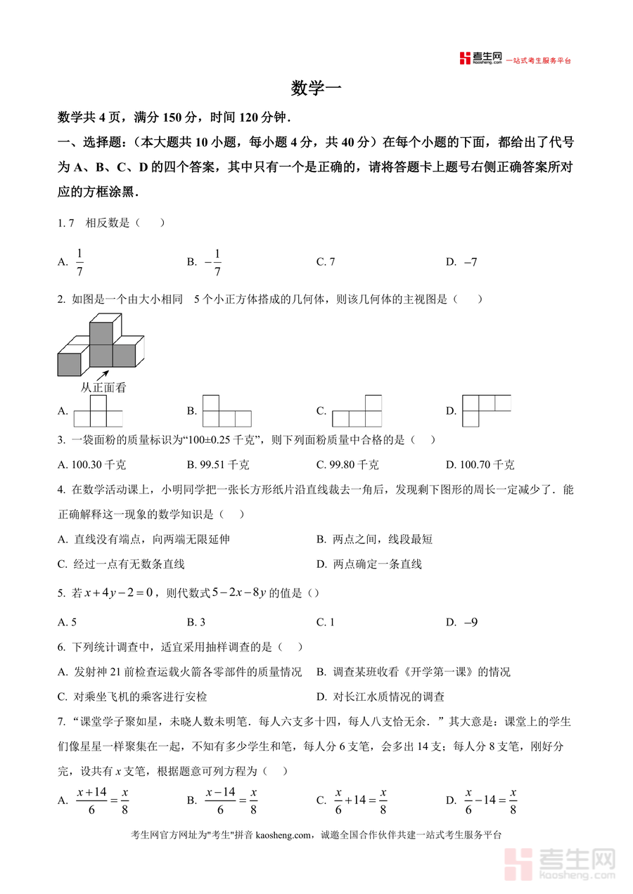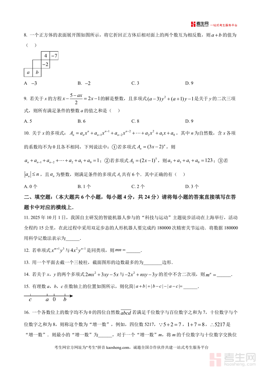 《精品解析:2025-2026学年七年级上期期末试题数学试题(原卷版).docx》是一份面向七年级学生的期末数学备考资料,主要内容涵盖选择题、填空题、解答题等完整题型结构(如10道选择、6道填空、8道解答题),覆盖相反数、几何体视图、科学记数法、同类项等七年级上期核心知识点,特色亮点在于严格遵循课标要求设计试题,题型分布与期末考完全一致,能真实还原考试场景,帮助学生提前熟悉命题逻辑与考点设置。