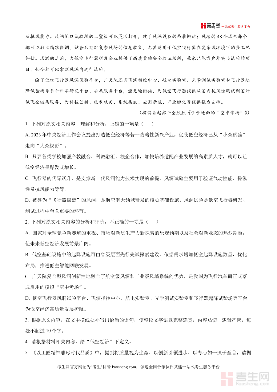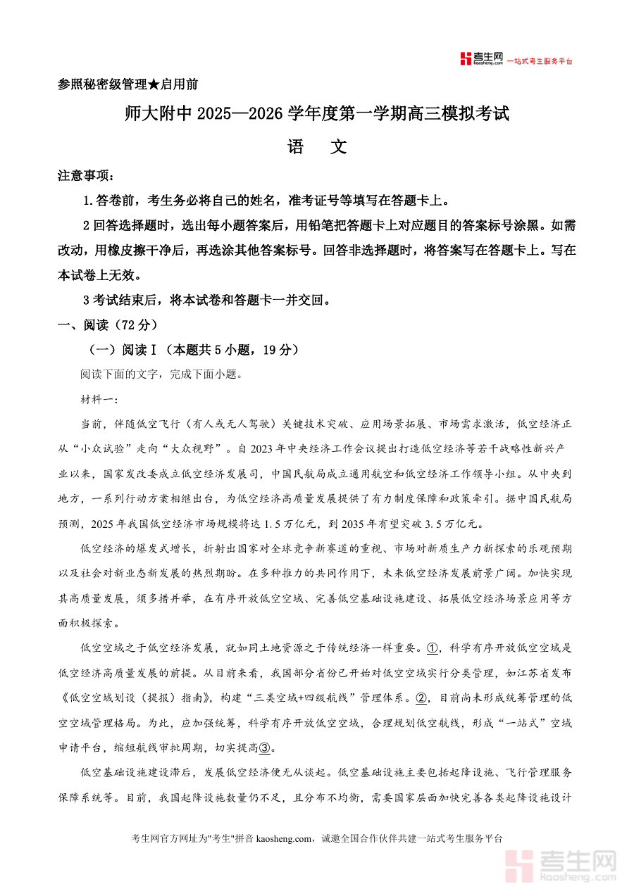 《精品解析:2026届山东省济南市山东师大附中高三一模语文试题(原卷版).docx》是一份面向2026届高三学生的权威语文备考资料与真题级模考试卷原卷文件。内容完整呈现山东师大附中高三模拟考试语文试题全貌,涵盖阅读Ⅰ(含低空经济主题论述类文本)、阅读Ⅱ(含萧红《呼兰河传》节选文学类文本)等核心题型,并保留考试注意事项、题型分值分布及材料原文等真实考试细节;其特色在于贴合山东省高考语文命题趋势,融入区域名校精准命题视角,为考生提供贴近实战场景的训练素材与数据支撑,属于高质量真题解析类备考资源范畴.