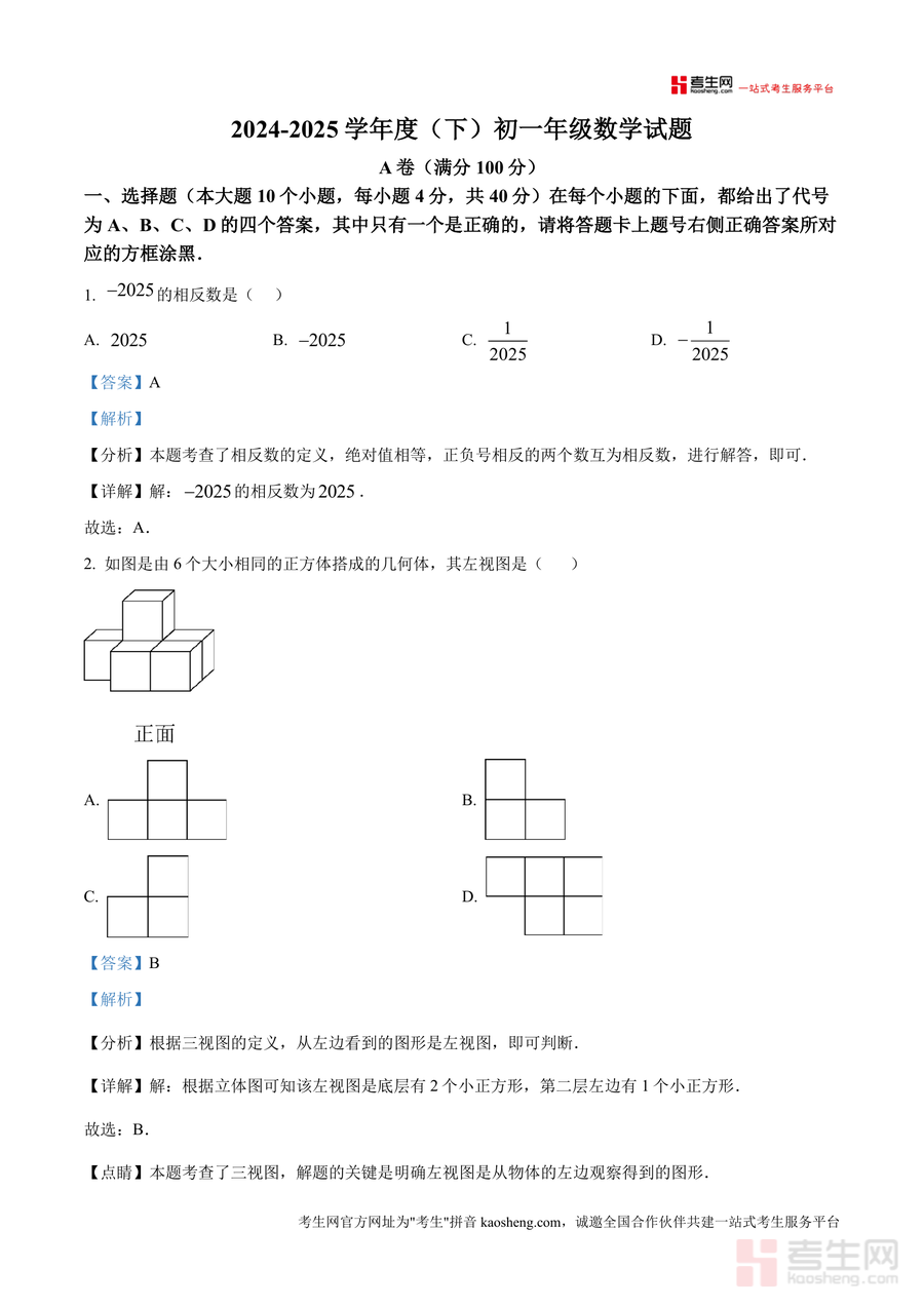《精品解析:重庆市第八中学校2024—2025学年七年级下学期开学考试数学试题(解析版).docx》是一份聚焦七年级数学开学考的优质真题解析资料,核心内容包含A卷(满分100分)与B卷(满分50分)完整试题及逐题深度解析,覆盖选择题、填空题、解答题三大题型;每道题均配备考点定位、详细解题步骤及易错点点睛,特色亮点在于解析紧密结合教材核心知识点与应试技巧,如对相反数定义、左视图判断等基础考点的精准解读,以及幂运算、平方差公式等核心知识应用示例,为学生提供全面专业的解题指导。