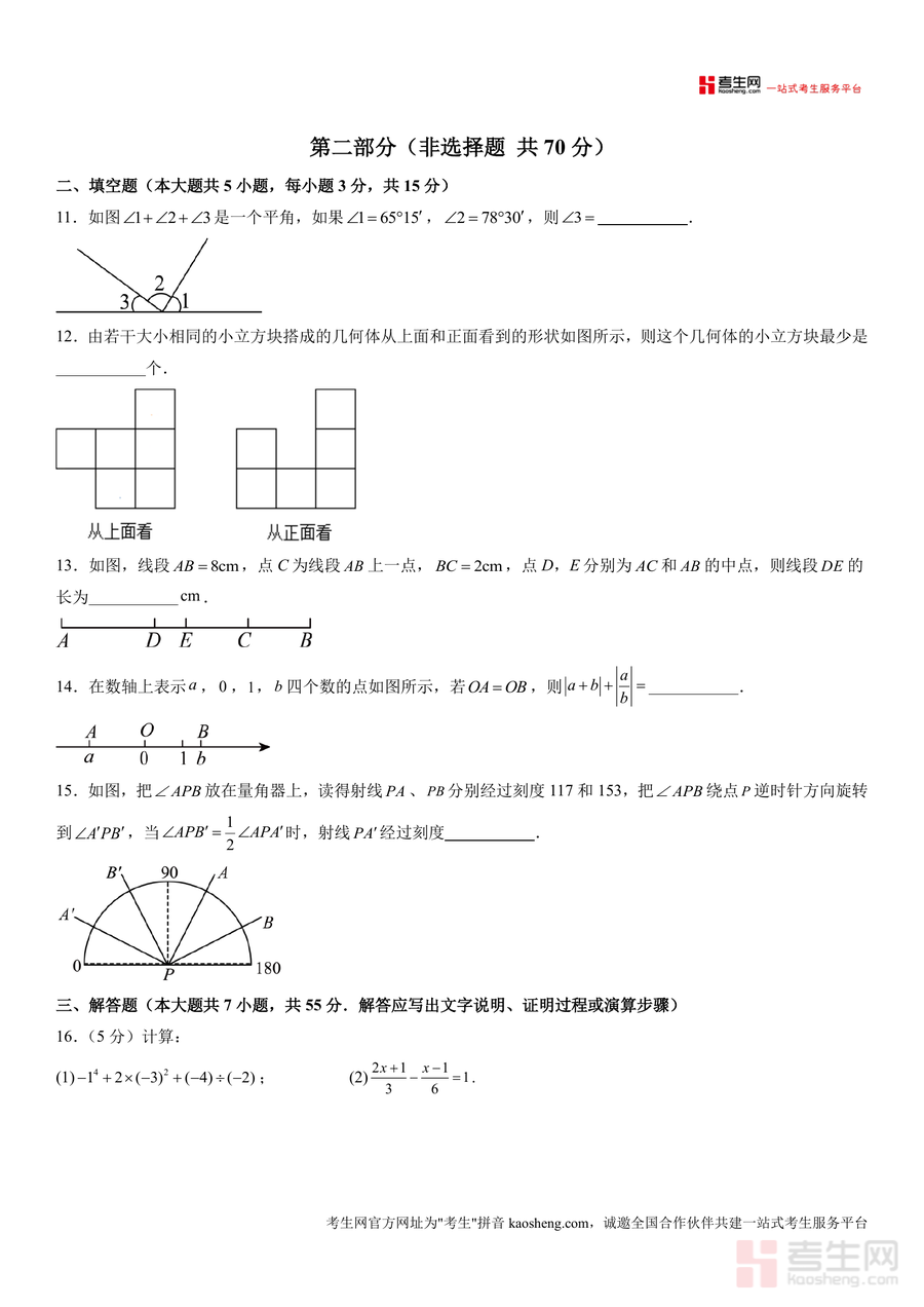 《七年级数学开学摸底考(广东深圳卷专用)(考试版).docx》是一份针对广东深圳地区七年级学生设计的开学摸底备考资料,聚焦七年级上学期核心数学知识,涵盖数与代数、图形与几何、统计与概率三大模块。试卷严格遵循深圳本地教学大纲及考试命题趋势,设置90分钟100分的标准考试时长与规范答题流程(含答题卡使用说明),题型包括选择题(30分)、填空题(15分)、解答题(55分)三大类,覆盖绝对值、科学记数法、正方体展开图、代数式求值、几何角度计算、方程应用等高频考点,且融入本地学情特色题型(如结合深圳生活场景的统计调查题与实际应用问题),助力学生精准把握考点分布与命题规律。