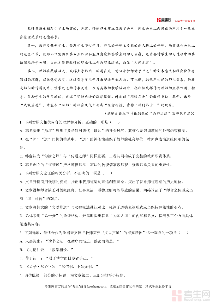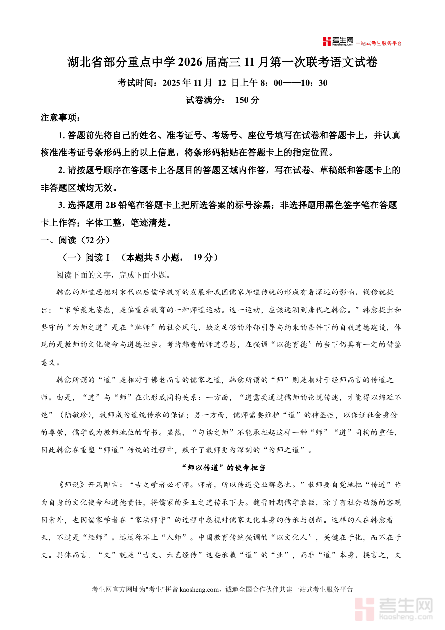 《精品解析:2026届湖北省部分重点中学高三上学期第一次联考(一模)语文试题(原卷版).docx》是一份聚焦2026届高三语文备考需求、贴合湖北重点中学联考命题趋势的权威资料文件。文件完整呈现联考原卷结构,包含考试时间(2025年11月12日)、满分(150分)等规范注意事项,以及阅读(72分)等核心模块;阅读部分涵盖论述类文本(韩愈师道思想现代启思)、文学类文本(茅盾《虹》节选)等经典内容考查,深度对接高考核心考点如论证分析、人物形象解读等,为备考资料提供精准命题参考,助力学生把握联考题型特点与应试方向.