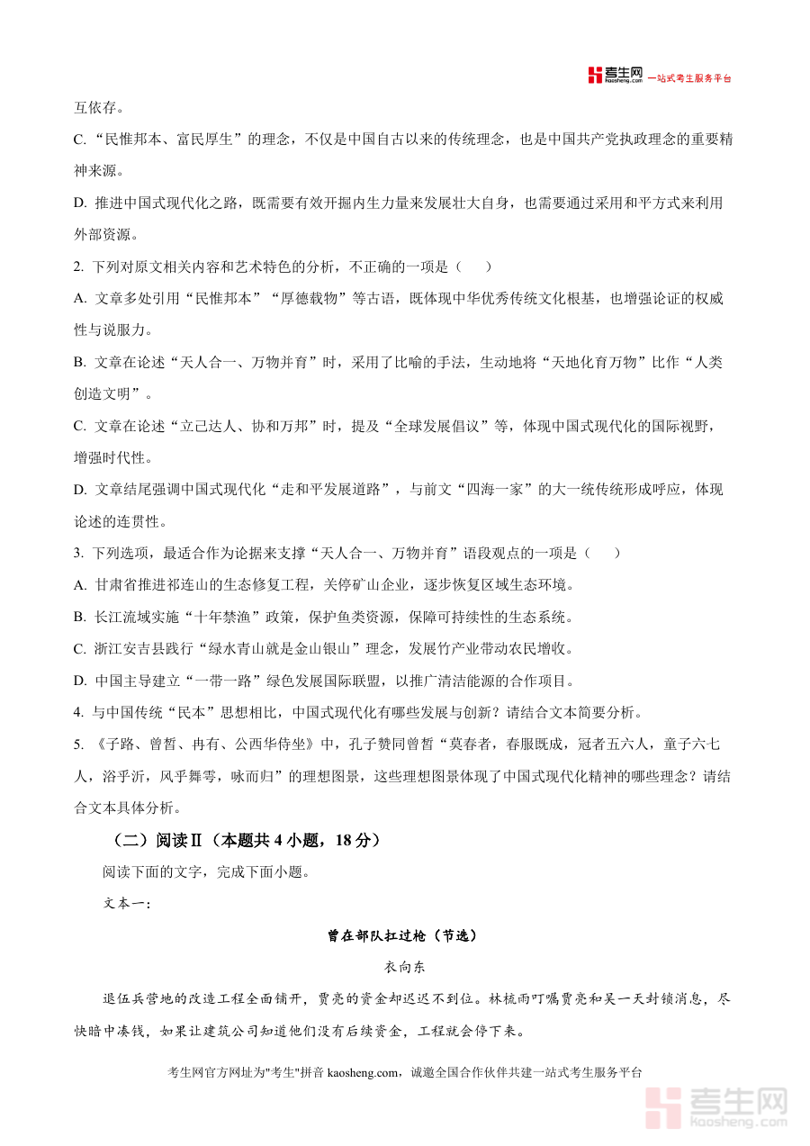 《精品解析:2026届贵州省六盘水市高三一模语文试题(原卷版).docx》是一份聚焦贵州省六盘水市高三一轮复习阶段检测的专业备考资料,精准贴合本地教研导向与全国高考命题趋势,包含完整原卷及深度解析内容。原卷严格遵循高考语文试卷结构,考试时长150分钟满分150分,覆盖阅读(含论述类文本《中国式现代化精神底蕴探赜》、文学类文本《曾在部队扛过枪》节选等)、古代诗文阅读等核心题型;解析部分结合本地学情,对热点话题类题目进行逻辑拆解,对文学类文本人物形象与主题分析提供分层解题路径,帮助学生把握命题规律与得分要点,兼具权威性与实用性。