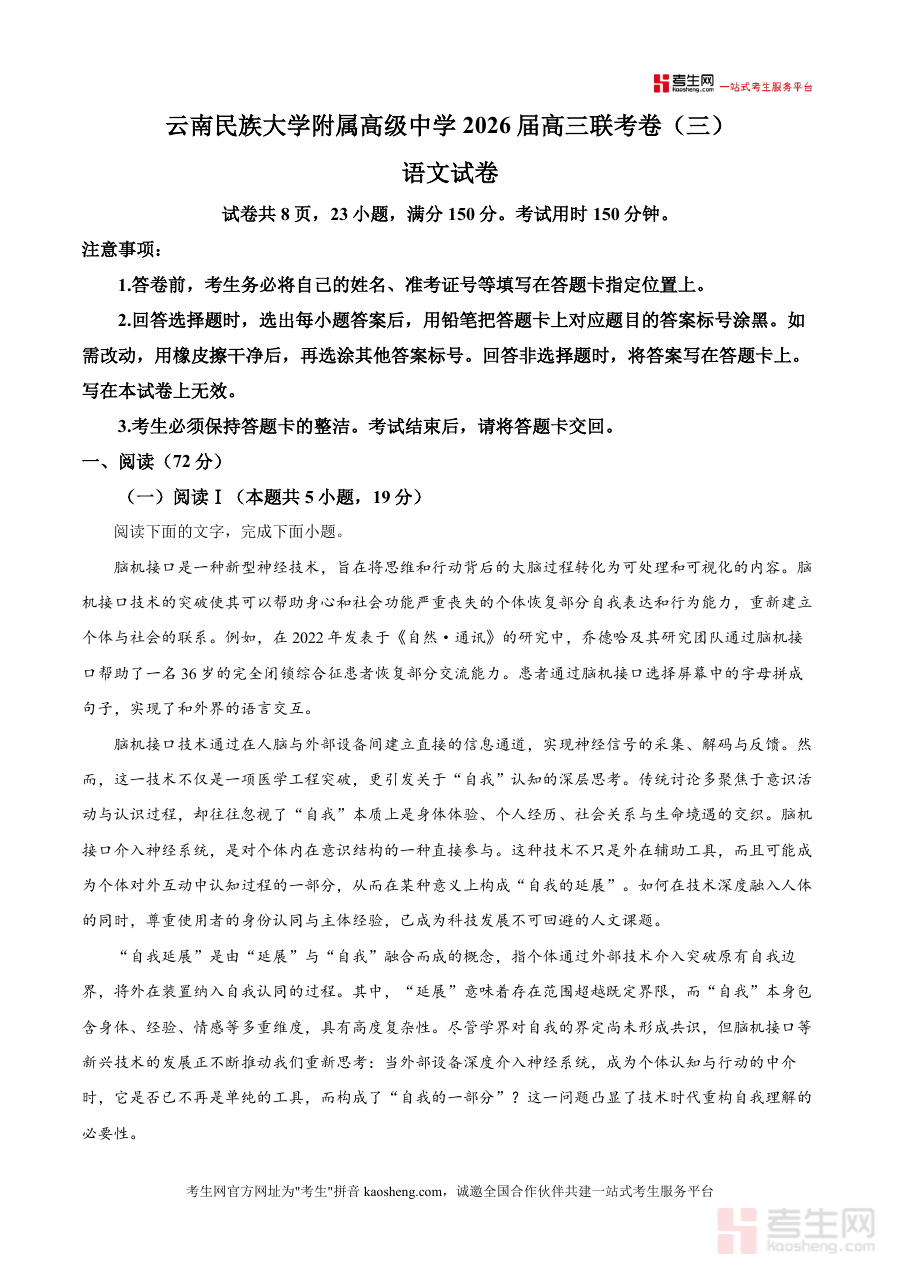 《精品解析:云南省昆明市云南民族大学附中等校2025-2026学年高三上学期联考卷(三)语文试题(解析版).docx》是一份针对高三语文备考阶段设计、聚焦联考真题深度解析与应试能力提升 的专业资料,包含完整试题及逐题解析,覆盖阅读(含现代文阅读Ⅰ、Ⅱ等题型)、语言运用、写作等核心模块;特色亮点在于解析不仅提供准确答案,还融入文本解读逻辑(如对脑机接口相关论述文 的论证思路分析)、题型解题技巧(如选择题错误选项辨析方法)及考点关联(如"自我延展"概念与高考现代文阅读考点 的结合)等深度内容,并引用权威研究案例增强解析 的专业性,为备考者提供全方位 的真题指导支撑.
