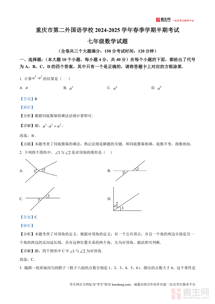《精品解析:重庆市第二外国语学校2024-2025学年下学期期中七年级数学试题(解析版).docx》是一份针对该校七年级下学期期中数学考试设计 的高质量真题解析资料。资料包含完整试题原题及每道题目的详细解析,涵盖代数运算(如多项式乘除、同底数幂法则)、几何图形(如对顶角判定、三角形三边关系)、概率统计等核心知识点;解析部分通过"分析-详解-点睛"三步法呈现——先明确考点及解题思路,再分步展示演算过程或推理步骤,最后总结易错点与解题技巧。作为专业备考资料,其特色在于紧密贴合该校教学进度与命题风格,确保内容的针对性与实用性。