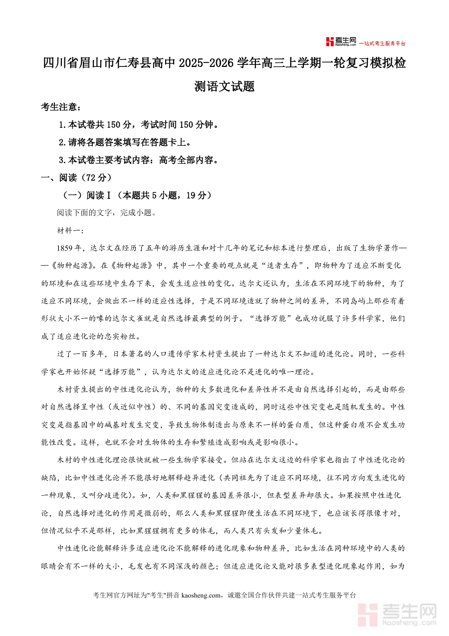 《精品解析:四川省眉山市仁寿县高中2025-2026学年高三上学期一轮复习模拟检测语文试题(解析版).docx》是一份聚焦高三语文一轮复习核心需求、贴合本地考情设计的专业备考资料。文件涵盖高考全部考查内容,包含阅读(含现代文阅读Ⅰ、Ⅱ)等核心题型,试题选材兼具学科深度与时代性,如以"生物进化论发展"为主题设置现代文阅读材料,既考查信息筛选与逻辑分析能力,又渗透科学思维素养;解析部分采用"题干拆解+选项辨析+答题思路梳理+背景拓展"四维模式,针对每道题详细说明命题意图,如选择题精准指出错误选项根源,主观题提供分层得分要点,帮助使用者全面理解考点本质,突出真题解析的专业性与实用性。