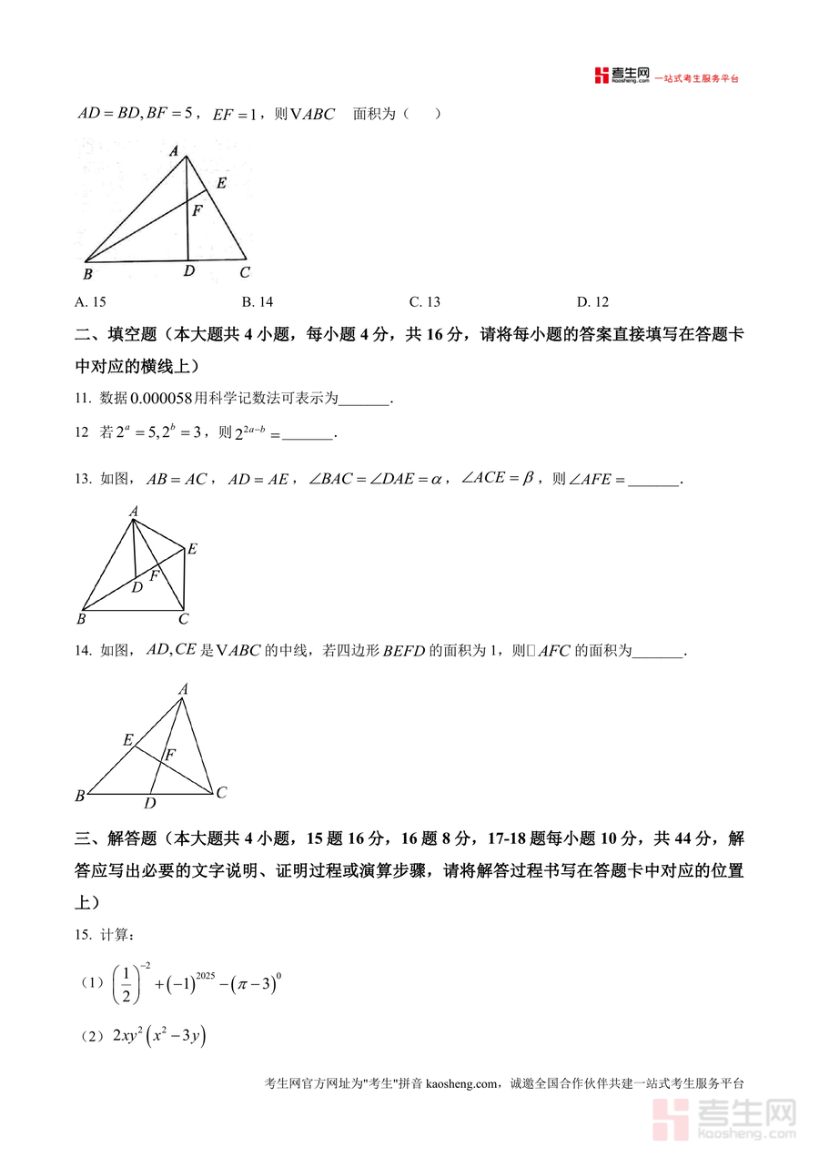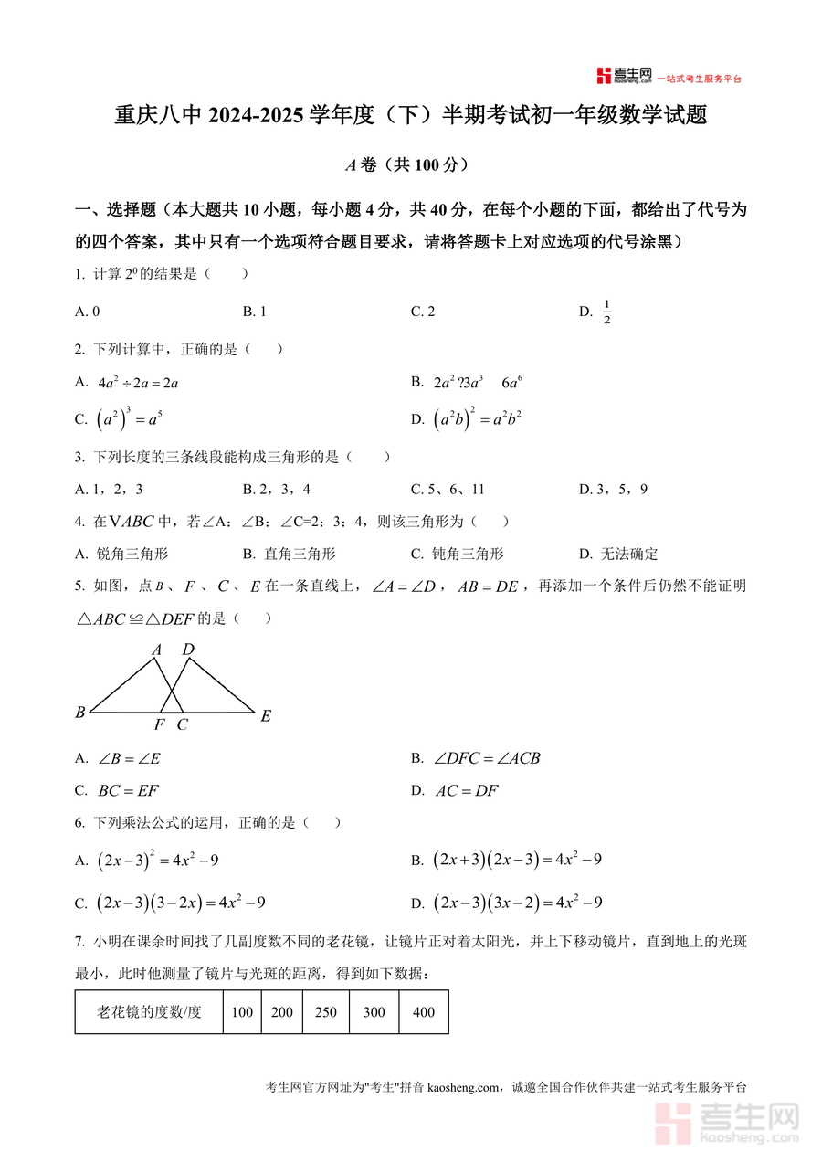 《精品解析:重庆市第八中学校2024-2025学年七年级下学期半期考试数学试题(原卷版)》是一份由重庆八中官方发布、贴合该校教学进度与命题风格的七年级数学半期考试真题原卷资料。内容涵盖A卷(100分)与B卷(50分),题型包括选择题、填空题及解答题三大类,涉及幂运算、三角形构成判定、全等三角形证明、函数图象分析、代数化简求值等七年级下册核心知识点。试题设置梯度合理,既有基础题检验知识掌握程度,也有综合题考查逻辑思维能力,能真实反映学生半期学习成效,是兼具权威性与实用性的备考资料。