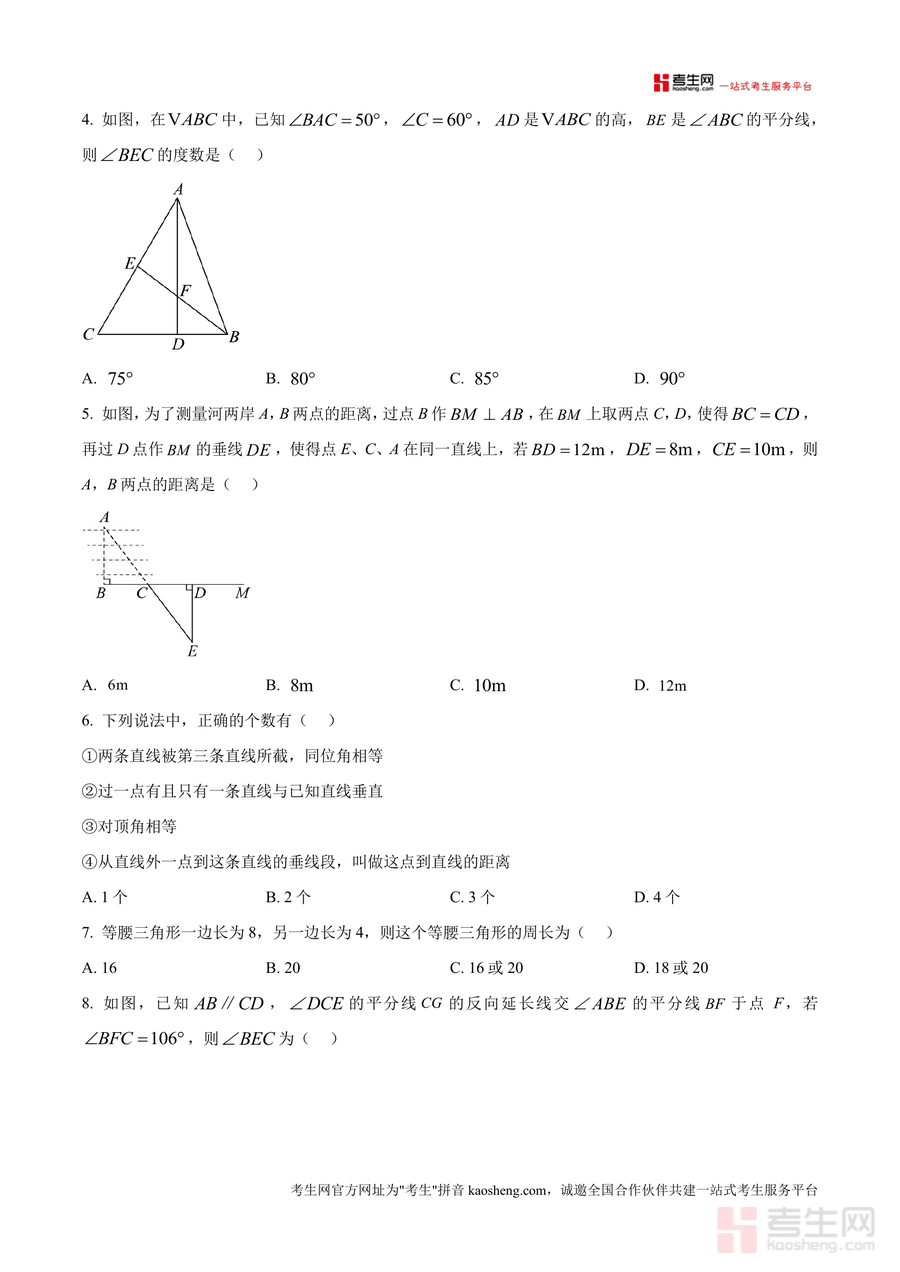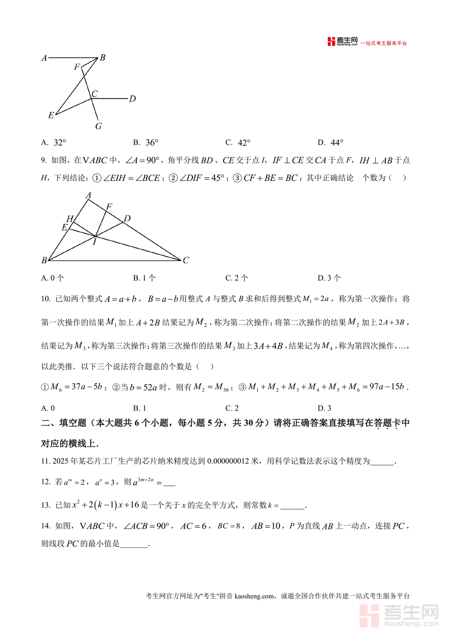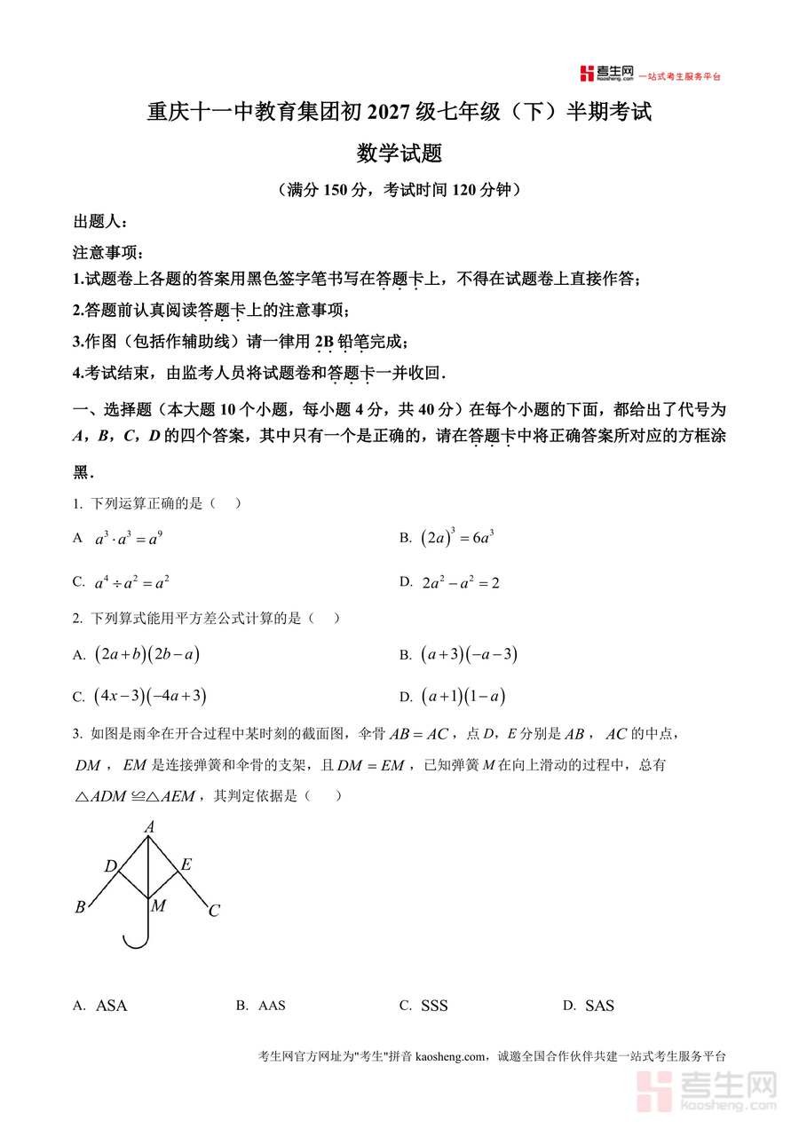 《精品解析:重庆市第十一中教育集团2024-2025学年七年级下学期半期考试数学试题(原卷版)》是一份针对七年级下学期数学半期考试设计的权威备考资料,包含完整原卷及配套解析内容。该资料严格遵循初中数学教学大纲要求编制,题型覆盖选择题(10题40分)、填空题(6题30分)及解答题(8题80分),知识点涉及代数运算(如科学记数法、完全平方公式)、几何图形(全等三角形、等腰三角形性质)及实际应用问题等核心内容。其特色亮点在于依托重庆十一中教育集团的教学资源优势,试题设计贴合区域教学实际与中考命题趋势,解析部分注重解题思路引导与方法总结,能有效帮助学生掌握考点精髓。