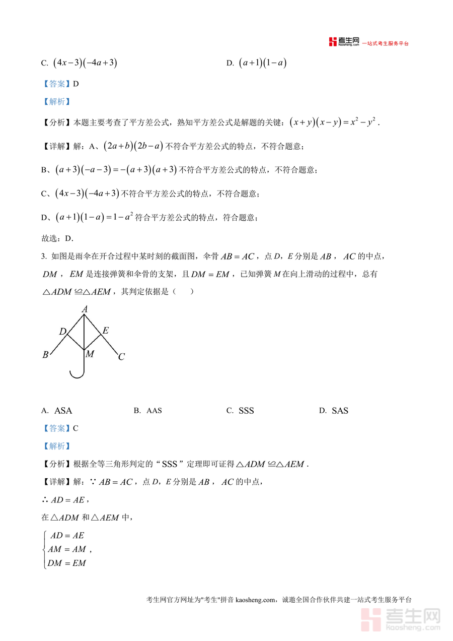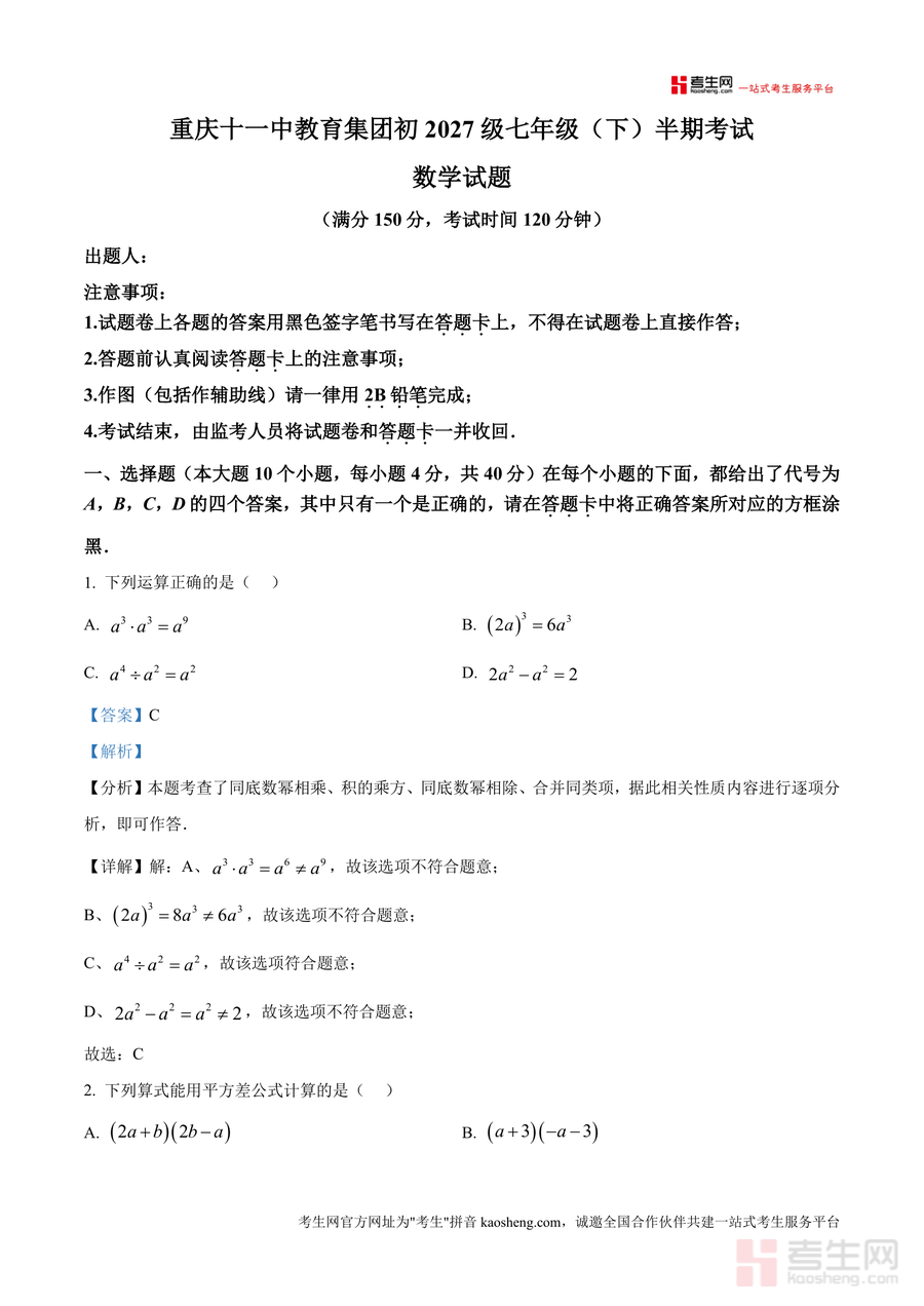 《精品解析:重庆市第十一中教育集团2024-2025学年七年级下学期半期考试数学试题(解析版).docx》是一份聚焦重庆本地名校集团校真题、服务七年级学生数学备考需求的专业资料。文件涵盖全卷10道选择题、6道填空题及8道解答题完整解析,特色亮点在于每道题均结合考点展开深度剖析——如选择题第3题通过伞骨结构案例讲解全等三角形“SSS”判定定理应用,填空题第13题对完全平方式常数项多解性进行推导,解答题部分融入简便运算技巧(如平方差公式、完全平方公式灵活运用)。