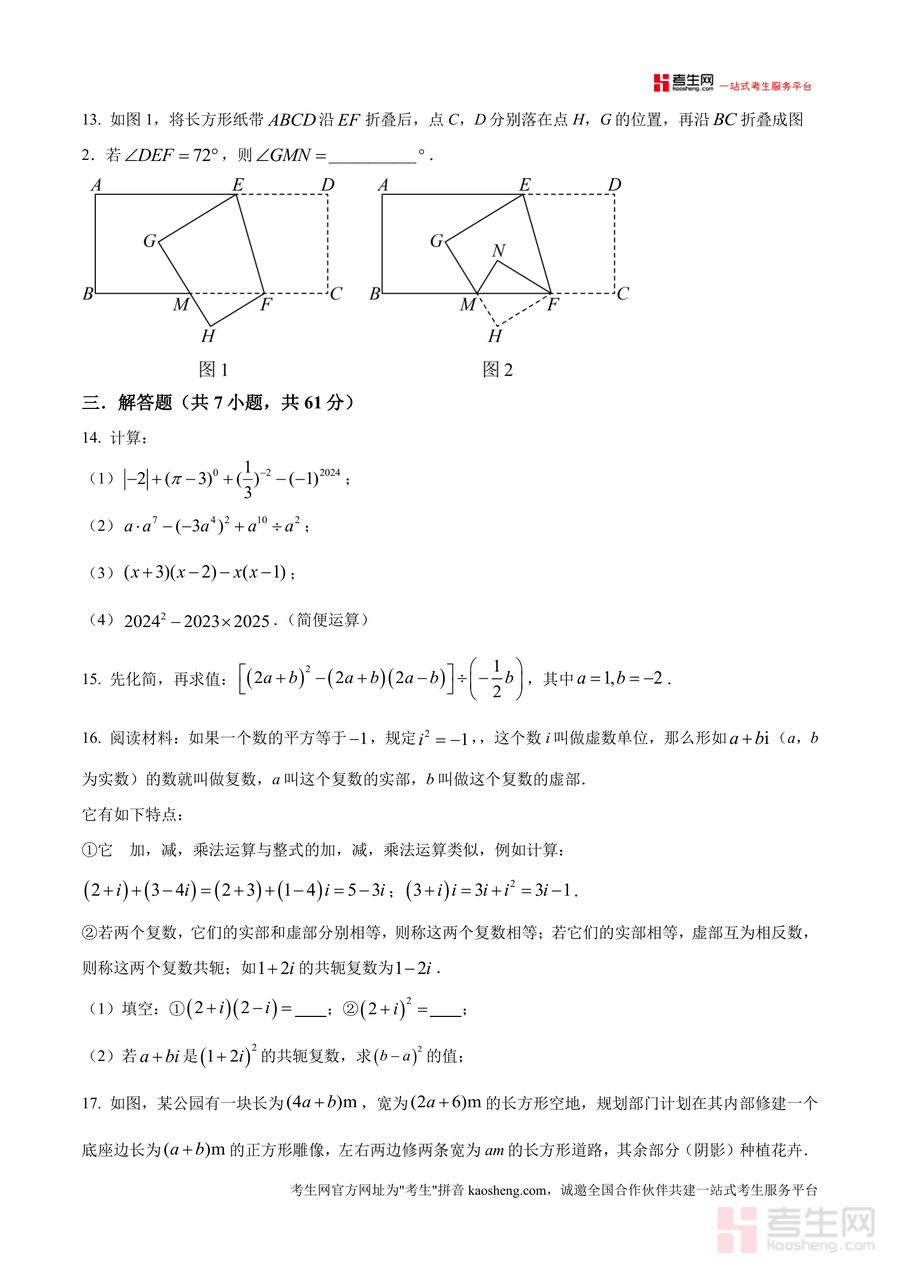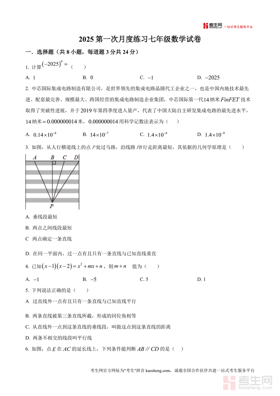 《精品解析:广东省深圳市罗湖区2024-2025学年下学期七年级数学第一次学情调研试题(原卷版).docx》是一份针对广东省深圳市罗湖区七年级下学期数学学科设计的高质量学情调研真题资料。该资料包含8道选择题、5道填空题及7道解答题,全面覆盖代数运算(如科学记数法、幂运算、完全平方公式应用)与几何图形(平行线判定与性质、垂线段最短原理)等核心知识点。其特色在于以原卷形式呈现,题目情境贴近本地教学实际——如融入“抖空竹”非遗文化案例、中芯国际纳米技术科学背景等,同时引入虚数单位等拓展性内容,兼顾基础巩固与能力提升,精准匹配罗湖区学情调研要求。
