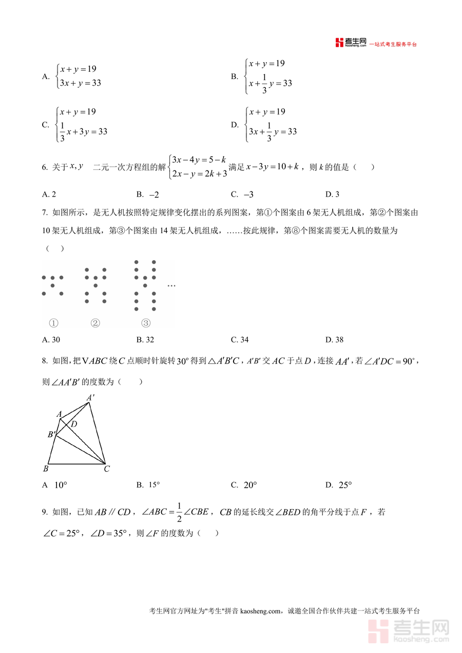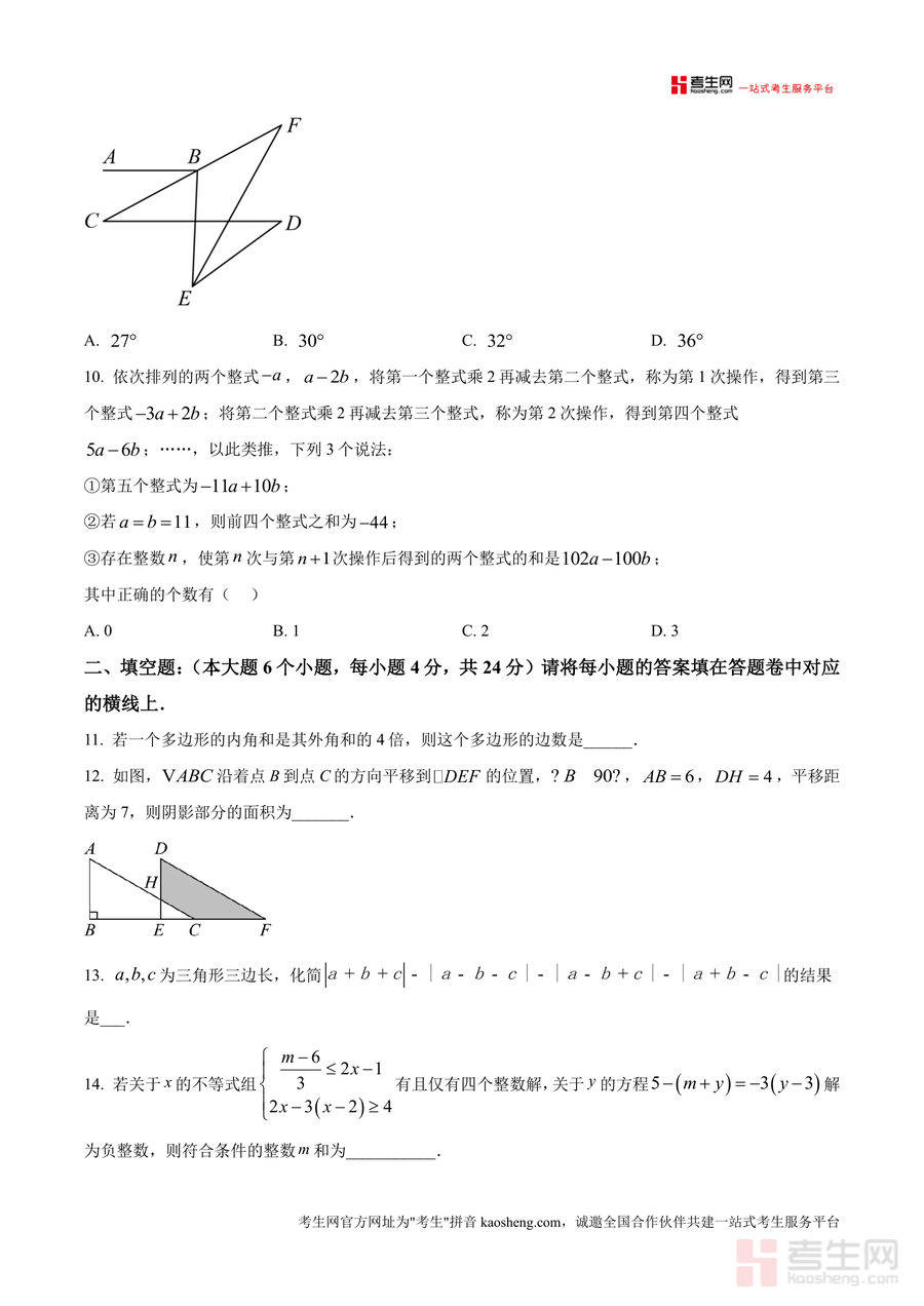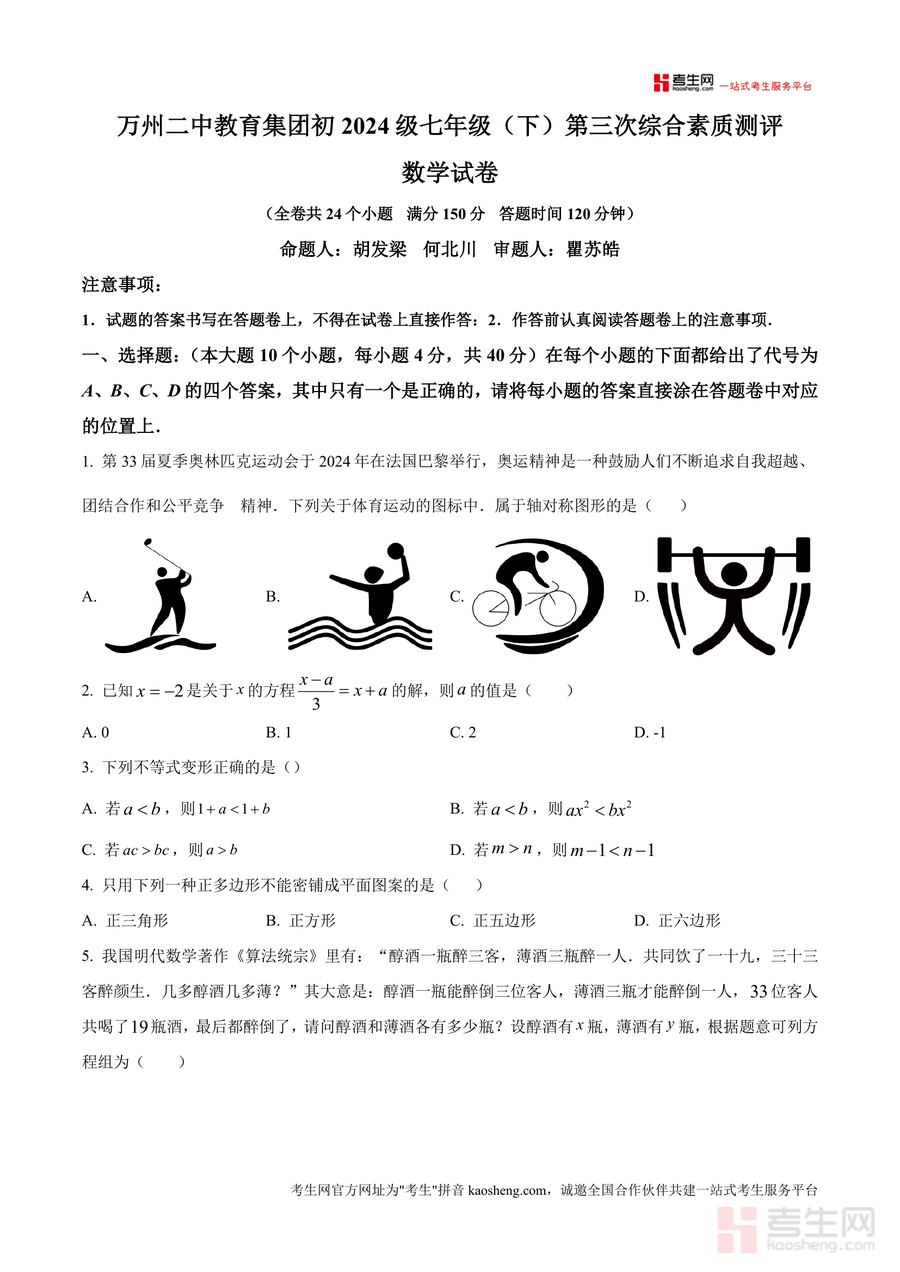 《精品解析:重庆市万州二中教育集团2024--2025学年七年级下学期第三次月考数学试卷 (原卷版).docx》是一份针对七年级下学期数学核心知识点设计的高质量备考资料。该试卷由万州二中教育集团专业命题团队编制(胡发梁、何北川命题,瞿苏皓审题),全卷共24个小题涵盖选择、填空、解答三大题型,满分150分且答题时间120分钟,覆盖轴对称图形识别、二元一次方程组求解、不等式变形应用、多边形内角和计算、几何变换及实际应用问题等七年级下册数学核心内容。其特色在于严格遵循初中数学课程标准,题型设置与中考命题方向接轨,既考查基础知识掌握程度,又注重逻辑思维与实践应用能力提升,能有效反映学生阶段性学习成果。