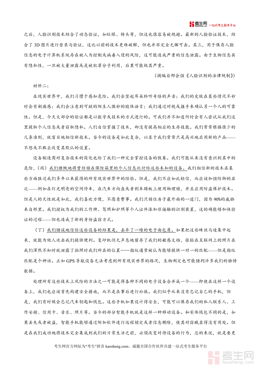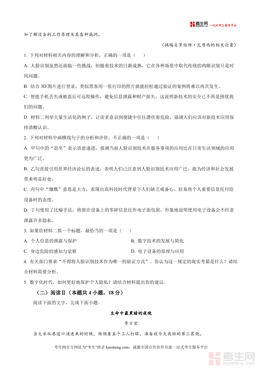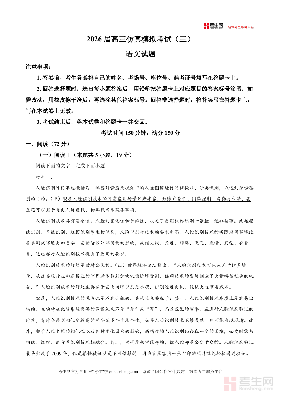 《精品解析:江西省部分校2025-2026学年高三上学期高考仿真模拟检测(三)语文试题(原卷版).docx》是一份针对江西省高三学生设计的高考语文仿真备考资料,核心定位为贴合本地命题趋势与考试要求,助力学生提前适应高考实战场景。该资料包含完整的语文试题结构,涵盖阅读(72分,含现代文阅读Ⅰ与文学类文本阅读Ⅱ)、写作等高考核心模块,题型设置与分值分布严格遵循新课标高考大纲,且选用人脸识别技术论述类文本、矿工透水事故文学作品等贴近时代与生活素材,既考查学生阅读理解能力与文学鉴赏水平,也渗透对社会热点与人文关怀议题的思考。其特色亮点在于仿真度高,试题难度与命题风格契合江西近年高考语文命题方向,为学生提供真实考试体验。