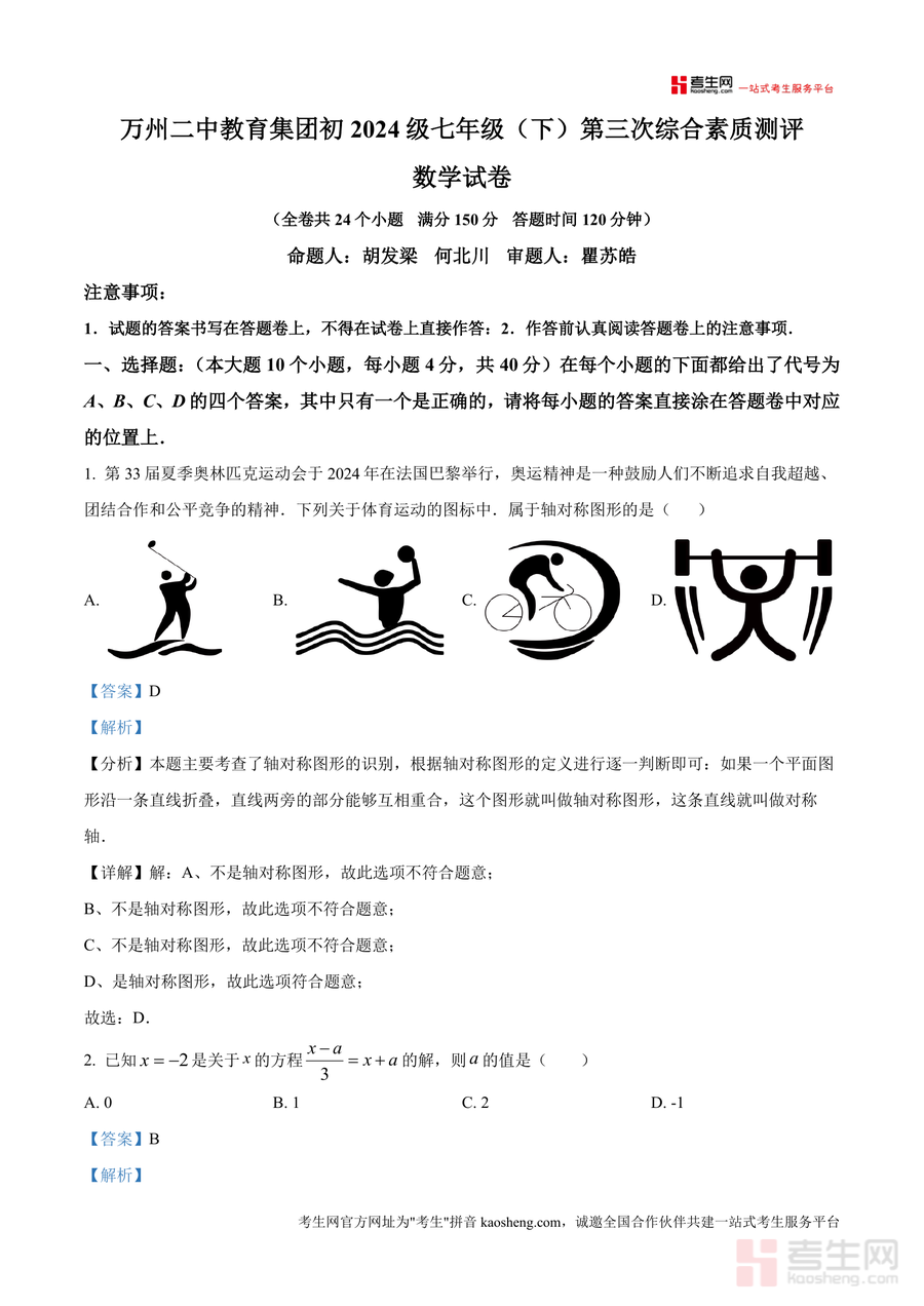 《精品解析:重庆市万州二中教育集团2024--2025学年七年级下学期第三次月考数学试卷(解析版)》是一份聚焦该集团七年级下学期数学阶段性测评需求设计专业备考资料。内容包含全卷24道小题(选择题10道40分、填空题6道24分、解答题8道86分)原题及深度解析。特色亮点在于由命题人胡发梁等参与编写解析,每道题均明确考点定位(如轴对称图形识别、不等式基本性质应用)、解题思路拆解及易错点提示,对几何旋转变换、二元一次方程组含参问题等难点进行细致剖析,帮助学生精准把握命题方向与核心考点。