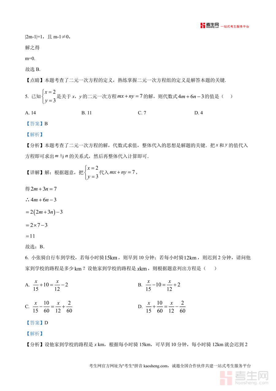 该资料核心用途是帮助学生巩固七年级下册数学核心知识(如一元一次方程、二元一次方程组等)并掌握解题方法,适用场景包括课后针对性复习、考前模拟训练及错题归因分析。对学生而言,通过真题解析可明确考点分布与命题趋势,快速提升应试能力;对教师及家长,则可作为教学辅助工具或辅导参考,精准把握学生知识薄弱点。其备考优势在于贴合万州国本中学月考难度与题型特点,解析深度契合学生认知水平,助力高效备考。