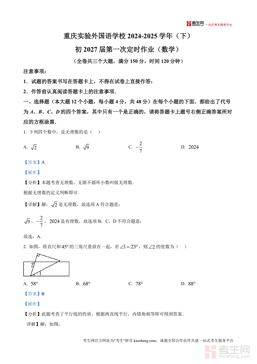 《精品解析:重庆市九龙坡区四川外国语大学附属外国语学校2024-2025学年七年级下学期3月月考数学试题(解析版)》是一份针对该校七年级下学期阶段性数学检测的专业真题解析资料。其核心内容包含全卷三大题型(选择题12道、填空题6道、解答题若干)完整试题及逐题深度解析,覆盖无理数判断、平行线性质、坐标规律探索等七年级下册核心考点。特色亮点在于每题配备明确考点分析(如第1题聚焦无理数定义)、分步解题思路拆解及易错提示(如第5题强调第二象限坐标特征),帮助学生精准把握考点本质与解题逻辑。
