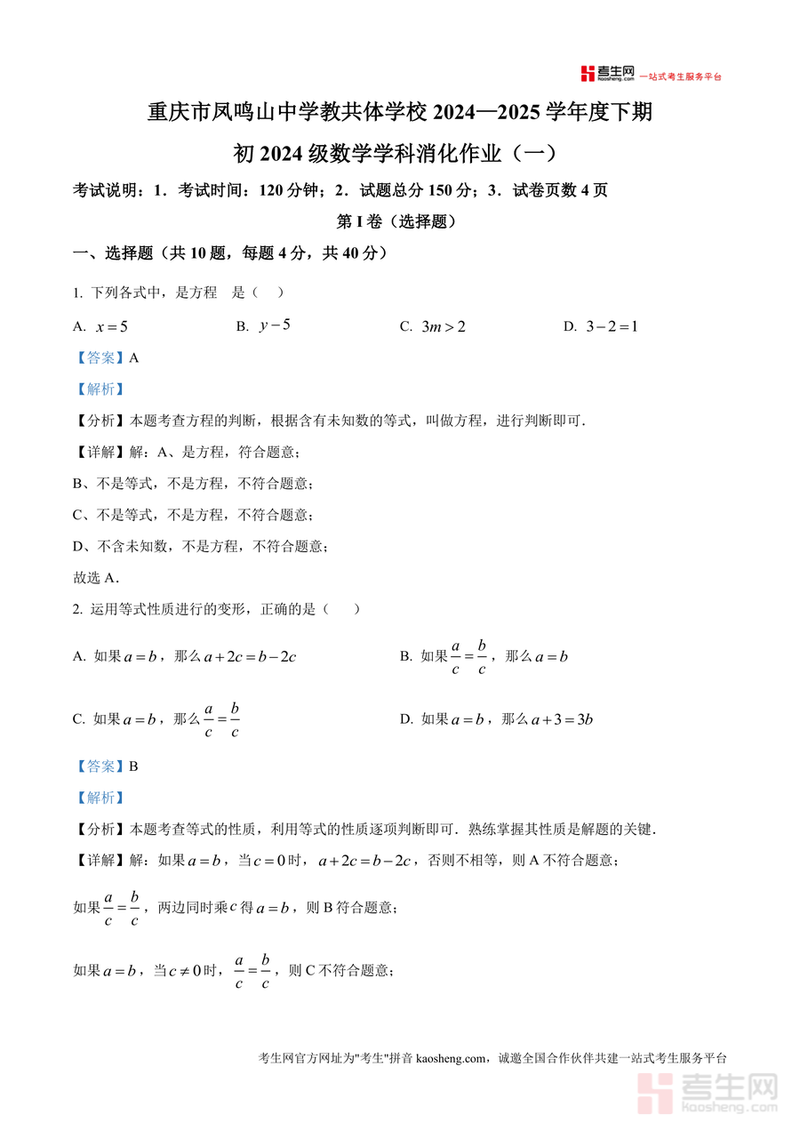《精品解析:重庆市凤鸣山中学教共体2024-2025学年七年级下学期3月阶段练习数学试题(解析版)》是一份针对本地教共体七年级数学阶段练习编写而成兼具权威性与实用性的备考资料。该资料包含完整试题及详细解析版,覆盖选择题、填空题及解答题三大题型,涵盖方程判断、等式性质应用、一元一次方程参数问题等核心考点;其特色亮点在于真题解析中融入考点拆解(如第9题《九章算术》应用题建模思路)、解题步骤(如去括号法则规范运用)及易错点提示(如等式性质除数不为0注意事项),同时结合应试能力培养需求,总结典型题型解题技巧。