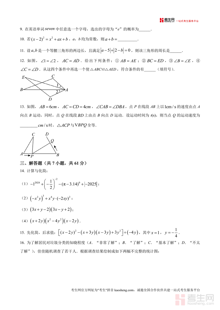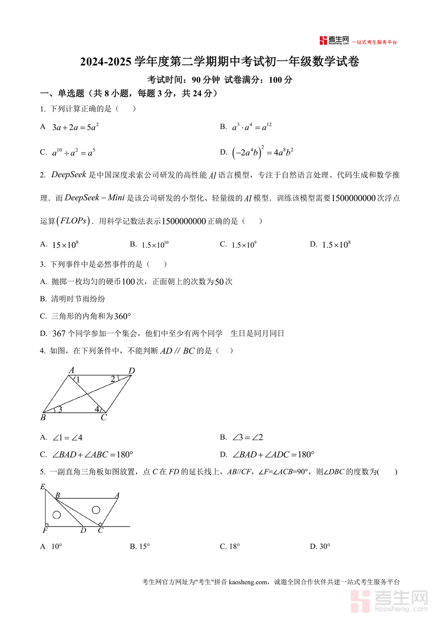 《精品解析:广东省深圳实验学校2024-2025学年七年级下学期数学期中考试卷(原卷版).docx》是一份针对深圳实验学校七年级下学期数学期中考查需求的权威真题资料。该资料完整呈现了原卷的题型结构与分值分布:包含单选题(8小题共24分)、填空题(5小题共15分)及解答题(7小题共61分)三大模块,覆盖科学记数法、三角形内角和定理、平行线判定与性质、全等三角形证明、概率计算、代数化简求值等核心知识点,命题风格贴合深圳实验学校教学进度与本地中考导向,保留原卷的真实命题逻辑与难度梯度。