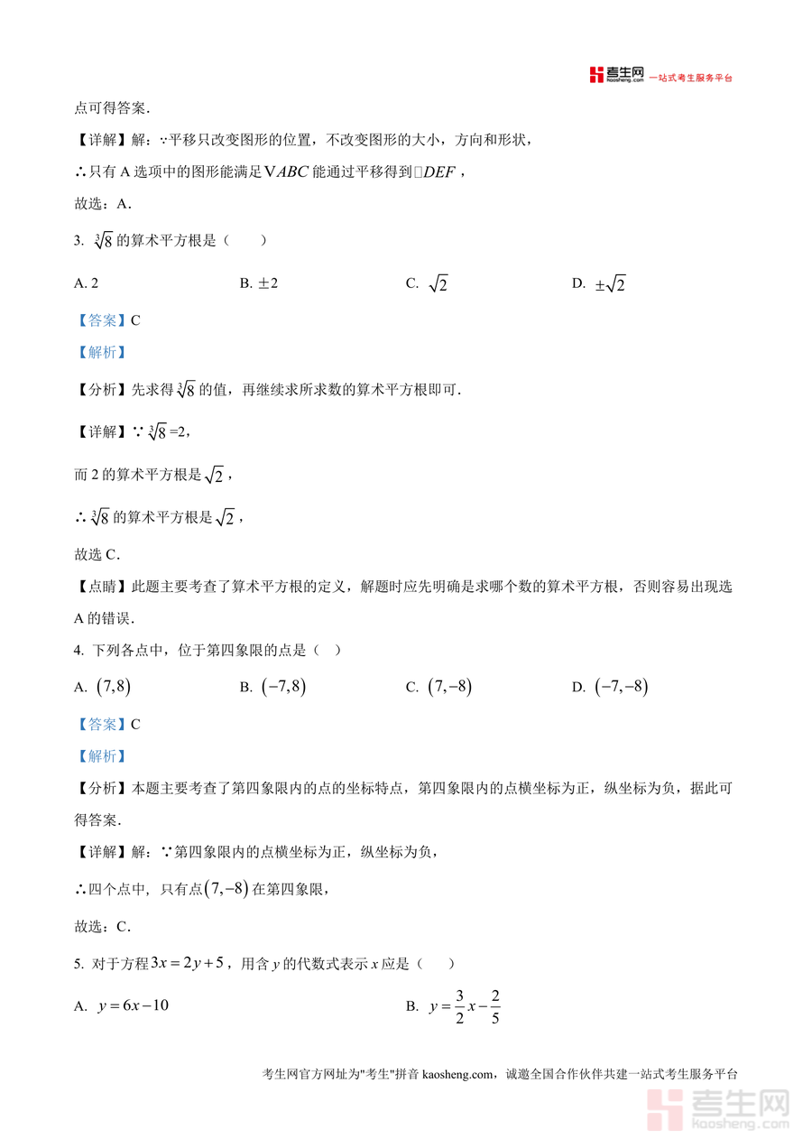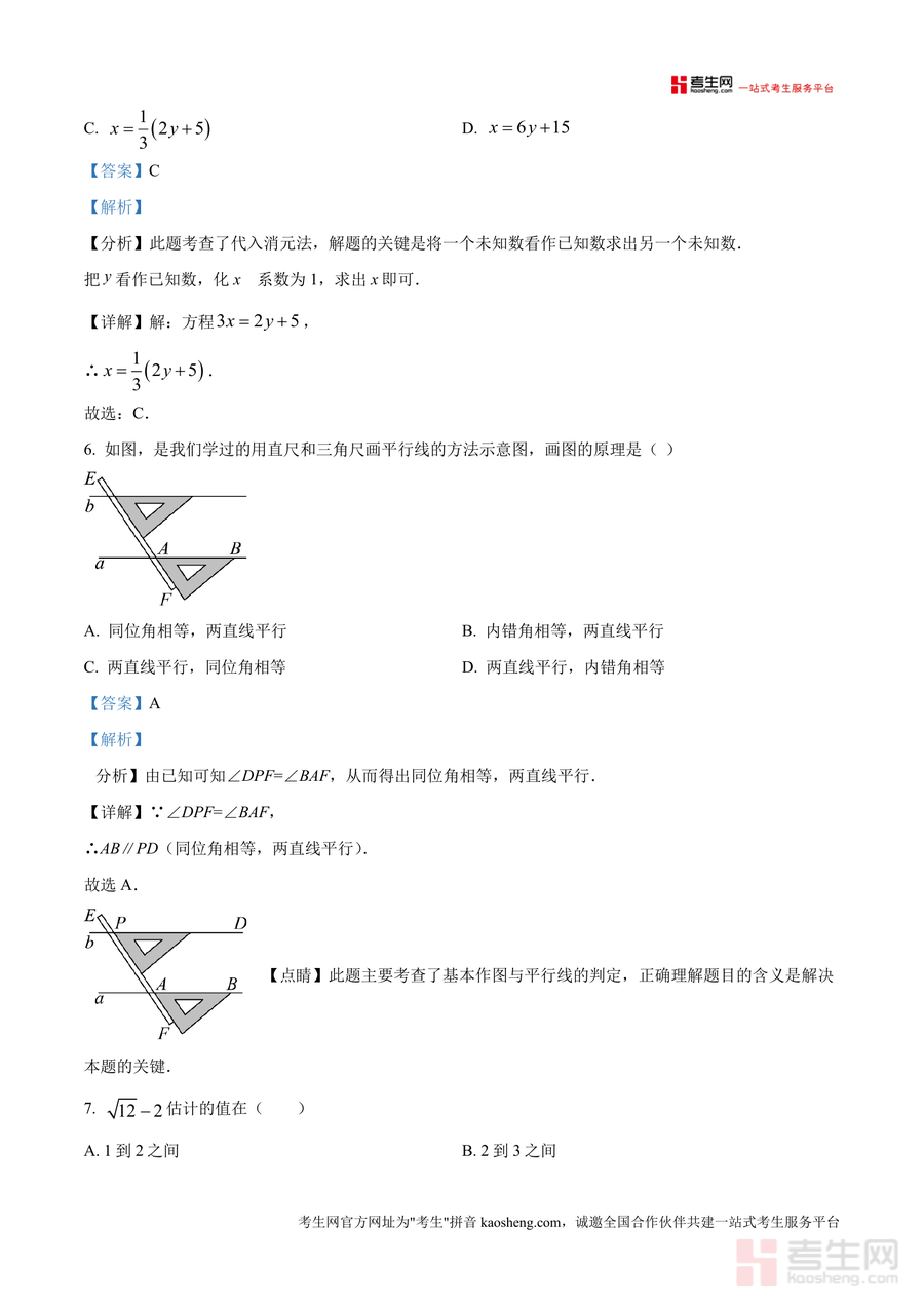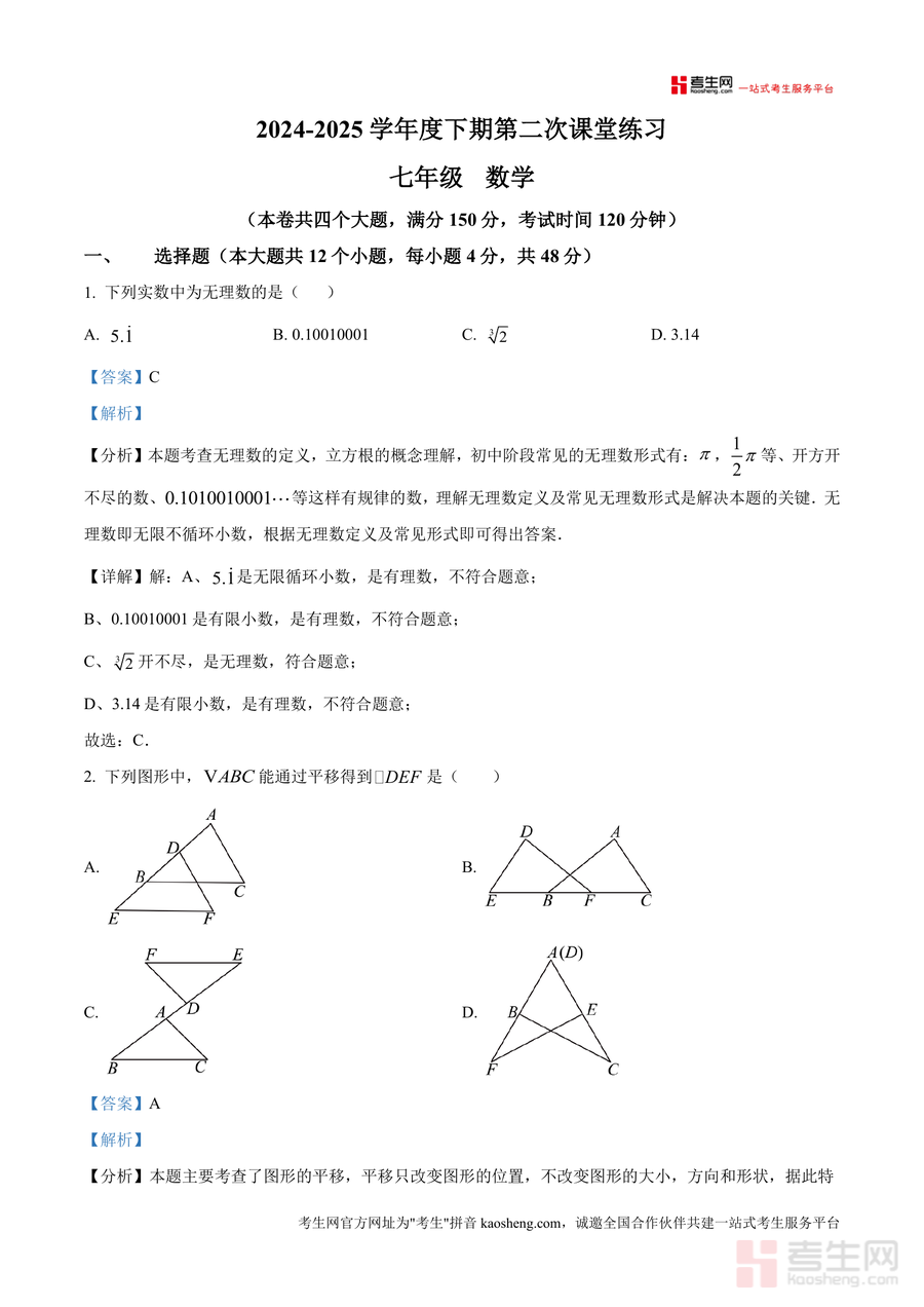 《精品解析:重庆市大足区双桥教育集团五校联考2024-2025学年七年级下学期第二次自主练习数学试题(解析版).docx》是一份针对区域联考真题开发设计专业备考资料。文件包含选择题、填空题、解答题全题型完整解析,覆盖实数概念(如无理数判别)、平面直角坐标系(如象限点特征)、平行线性质(如同位角判定)、二元一次方程组解法等七年级下学期核心知识点;特色亮点在于每道题均配备考点分析(如第1题明确无理数定义及常见形式)、步骤拆解(如第3题先求算术平方根再推导)、易错点提示(如第3题避免混淆算术平方根与平方根),帮助学生深入理解解题逻辑。