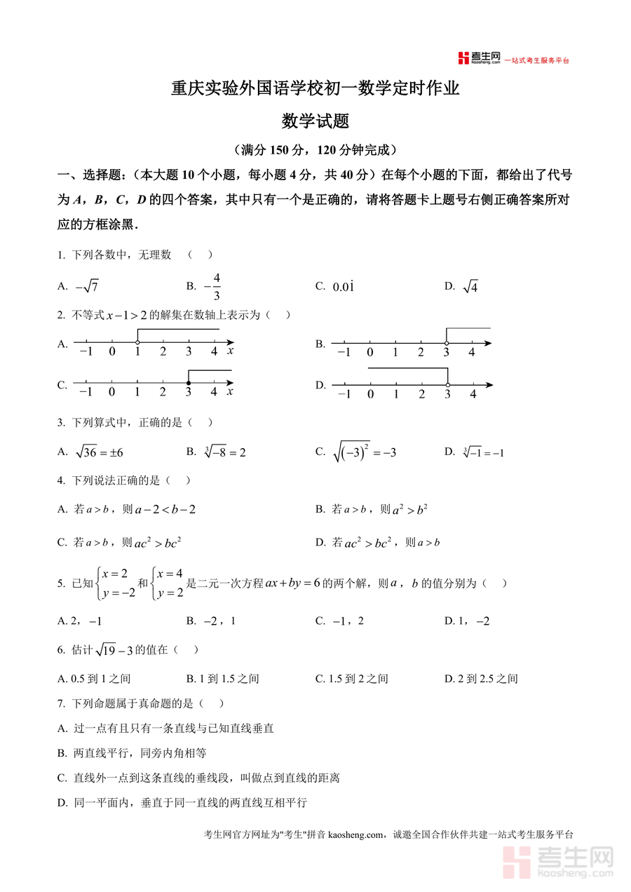 《精品解析:重庆市实验外国语中学校2024-2025学年七年级下学期3月定时作业数学试题(原卷版).docx》是一份贴合重庆实验外国语中学初一数学教学进度与命题体系的同步定时作业原卷资料。该资料严格依据七年级下册数学核心知识点编排,包含选择题(10小题共40分)、填空题(10小题共40分)、解答题(7小题共70分)三大题型合计27道题目,覆盖无理数识别、不等式解法与数轴表示、二元一次方程组应用、几何命题判断及坐标平面图形变换等核心内容;其特色在于完整保留该校定时作业原题风貌与难度梯度——基础题聚焦知识掌握程度检测、中档题强化逻辑思维训练、压轴题提升综合应用能力,为学生提供原汁原味校本题型训练素材。