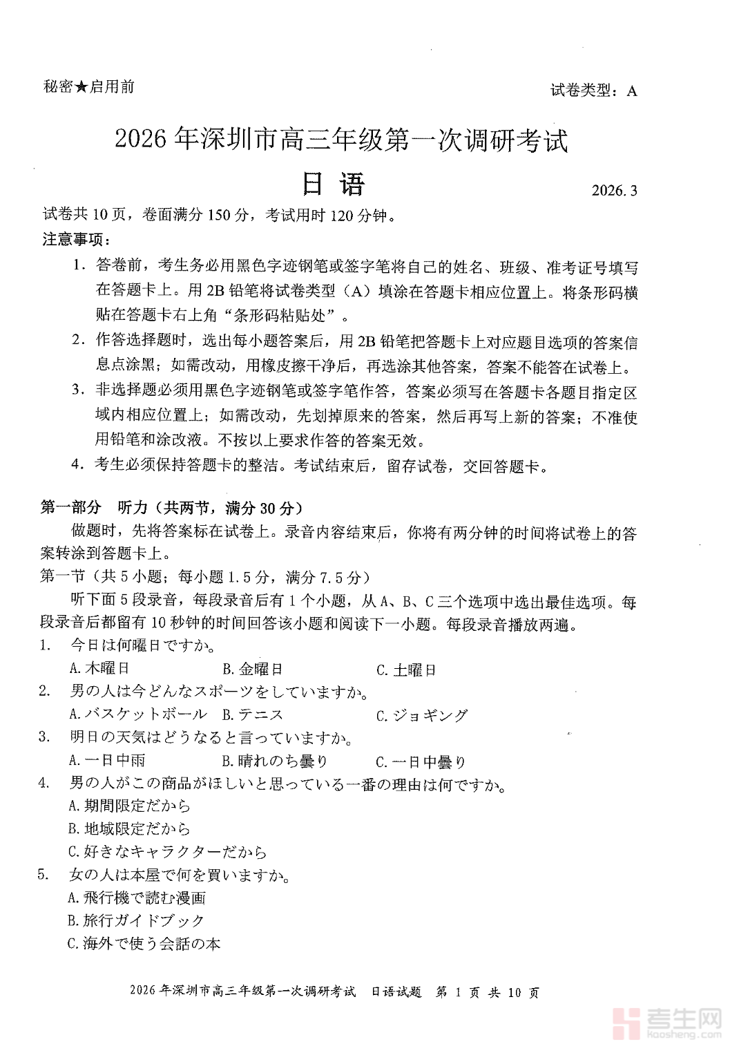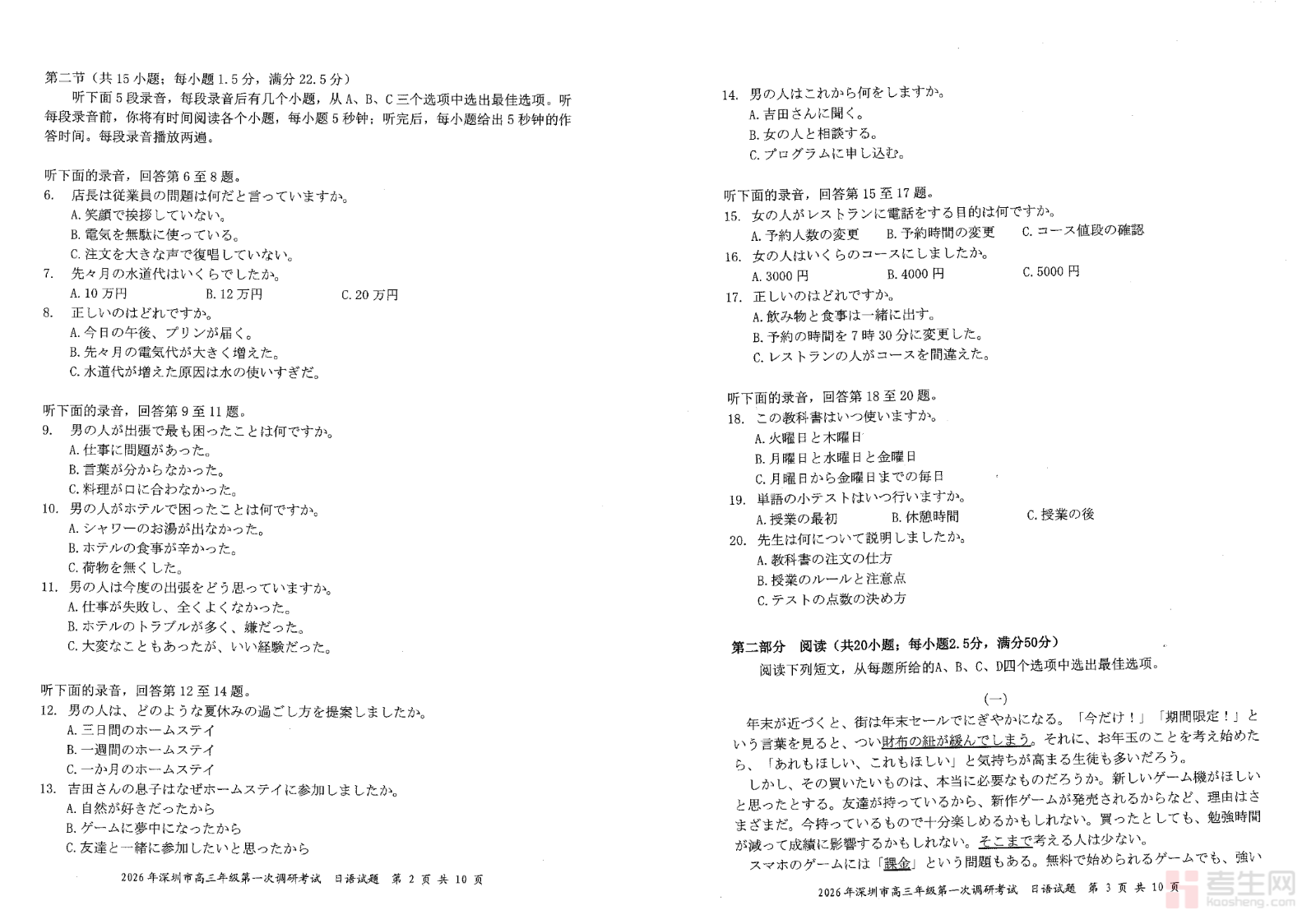 深圳市 2026 年高三年级第一次调研考试(日语试卷)由深圳市教育科学研究院命题,严格对标新高考日语命题要求,聚焦语言能力、文化意识、思维品质、学习能力四大核心素养。试卷覆盖听力、语言知识运用、阅读、写作四大模块,注重基础语法、词汇积累与真实语境下的语言应用,选材贴近校园、社会、科技等主题,题型规范、难度梯度合理,贴合高考命题趋势。本试卷可用于高三一轮复习效果检测,帮助考生精准定位薄弱环节、优化复习策略,是 2026 届高三日语考生备考的重要实战资料。请添加微信 18617049513 进专属群,获取更多免费资源!