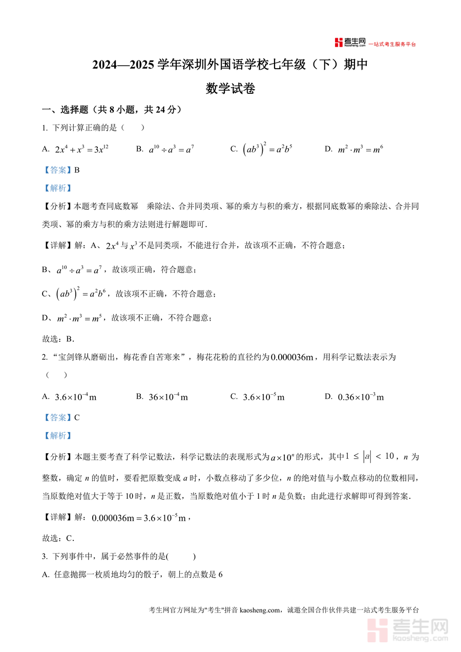 《精品解析:广东省深圳市深圳外国语学校2024-2025学年七年级下学期期中数学试卷(解析版).docx》是一份针对深圳外国语学校七年级下学期期中数学考试设计核心备考资料,包含完整真题试卷及逐题深度解析。内容覆盖选择题(8小题)、填空题(5小题)及解答题(7小题)三大题型,全面呈现校考命题范围;解析部分突出考点标注(如科学记数法、三角形三边关系等)、解题思路梳理及易错点警示,结合具体题目实例拆解核心知识应用逻辑,自然融入真题解析与应试能力培养要素,助力学生精准把握校考命题风格。