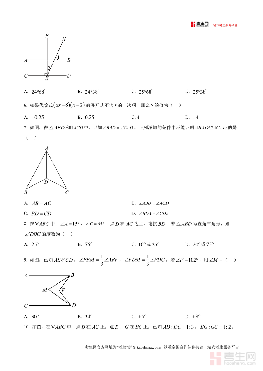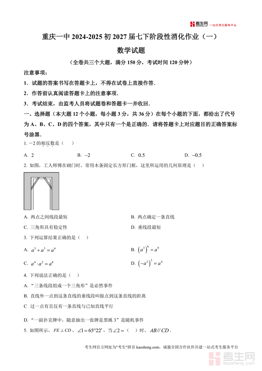 《精品解析:重庆市第一中学校2024-2025学年七年级下学期阶段性消化作业(一)数学试题(原卷版).docx》是一份针对七年级下学期数学知识的阶段性检测资料,由重庆一中命题,贴合该阶段教学进度与核心知识点。文件包含选择题、填空题及解答题三大题型,覆盖代数运算(如相反数、整式展开)、几何图形性质(如三角形稳定性、全等三角形证明)、概率统计(如随机事件判断)等模块,同时融入实际应用问题(如阶梯水价计算)与几何综合题,体现名校命题对知识迁移与综合运用能力的考查。其特色亮点在于严格遵循教学大纲,题目设计梯度合理,既能检测基础掌握情况,又能挑战思维深度,帮助学生全面消化近期所学内容。