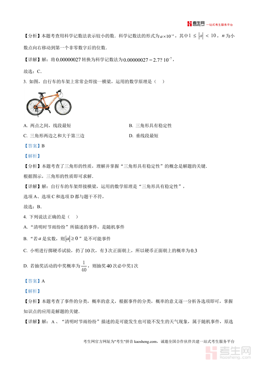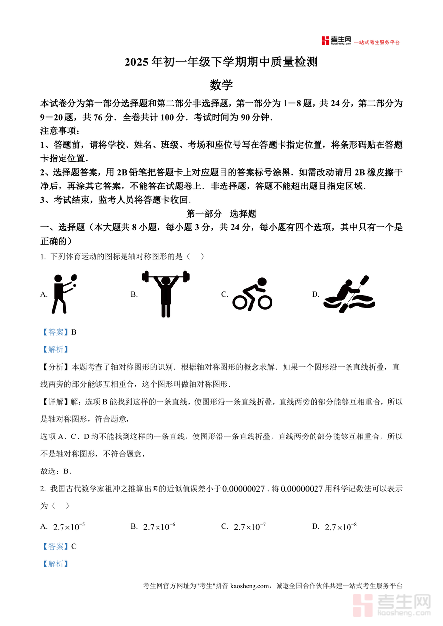 《精品解析:广东省深圳市福田实验教育集团(侨外)2024-2025学年下学期七年级期中数学试题 (解析版).docx》是一份针对该集团初一年级下学期期中数学考试真题设计开发专业解析资料。资料完整呈现试卷结构,含8道选择题(24分)、5道填空题(15分)及7道解答题(61分);每道题配备详细解析,涵盖考点标注、分步解题过程与思路点拨——如选择题中轴对称图形识别考点明确,解答题里全等三角形证明提供逻辑推导,科学记数法应用给出规范步骤。此外,资料融入本地校考命题特色,对高频考点如三角形稳定性、概率计算等做重点解读,助力使用者快速把握考试核心方向。