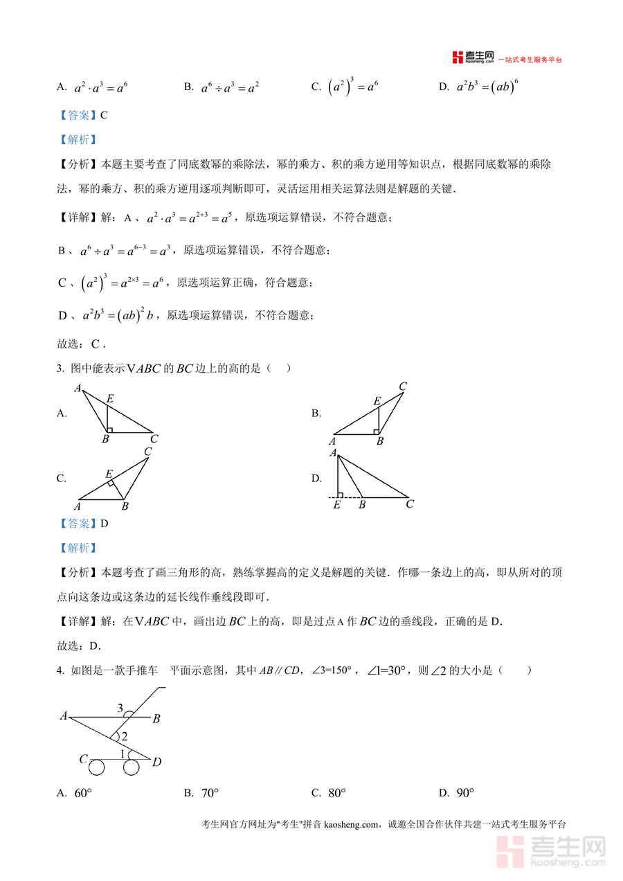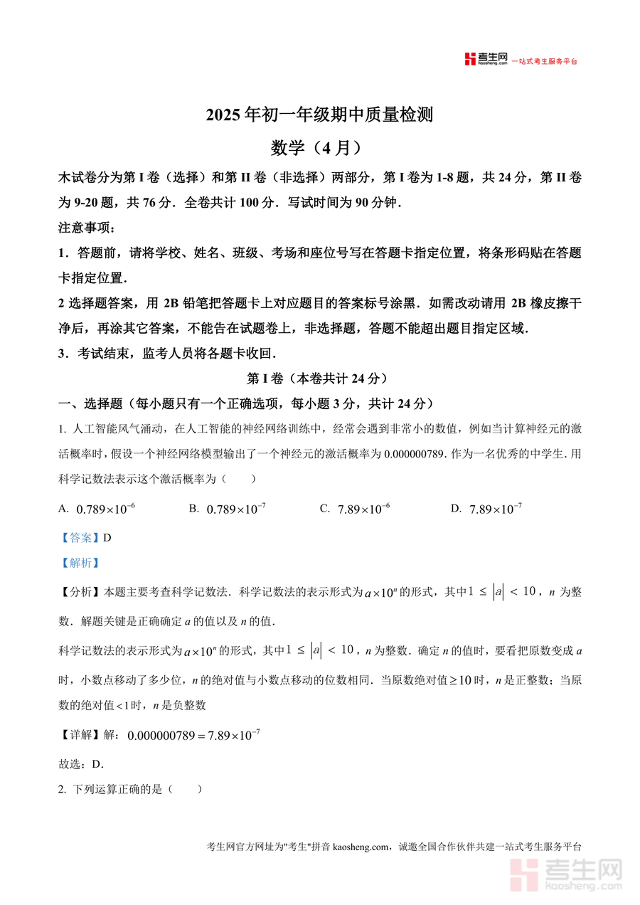 《精品解析:广东省深圳市第二实验学校2024-2025学年七年级下学期数学期中测试卷(解析版).docx》是一份针对深圳本地初中数学教学进度与考情设计的专业备考资料,核心内容包含完整期中测试卷结构及每道题目的深度真题解析。试卷严格遵循深圳二实期中命题规范分为选择与非选择两部分共20题覆盖科学记数法、整式运算、全等三角形判定、平行线性质等七年级下册核心考点;解析部分不仅提供准确答案更通过“分析-详解-点睛”三步法呈现解题逻辑如科学记数法题目明确a与n的确定规则全等三角形题强调ASA判定应用场景帮助使用者理解考点本质而非机械记忆。
