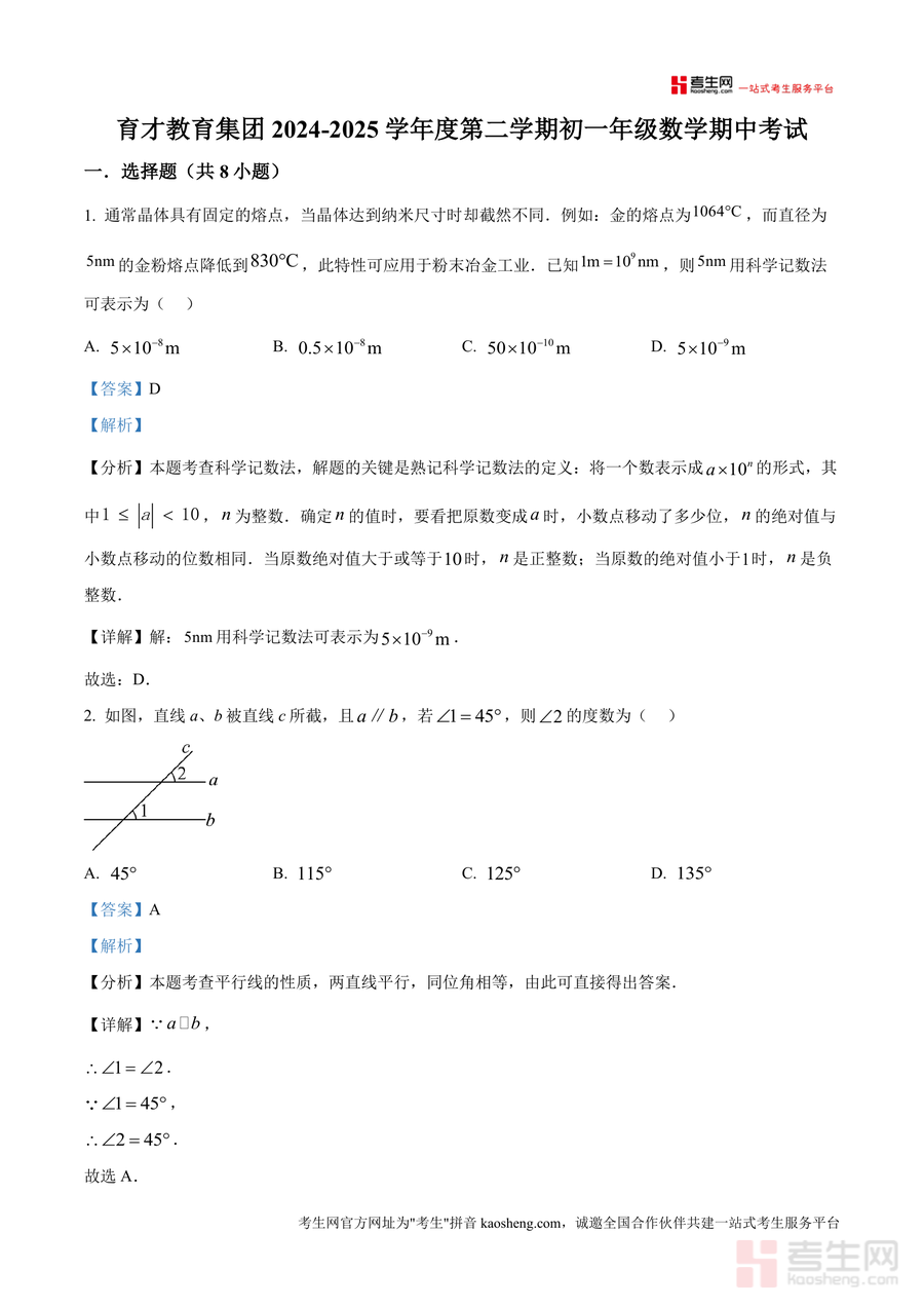 《精品解析:广东省深圳市蛇口育才教育集团2024-2025学年七年级下学期期中考试数学试卷(解析版).docx》是一份针对该教育集团期中数学考试设计的专业备考资料,涵盖选择题、填空题、解答题全题型内容。文件对每道题均提供详细解析,包含考点分析、解题思路及规范步骤,如科学记数法、平行线性质、三角形三边关系等核心知识点均有精准解读,并融入同类题型拓展提示。其特色在于结合集团教学进度与本地考情设计解析框架,帮助使用者快速定位知识盲区,掌握解题方法。