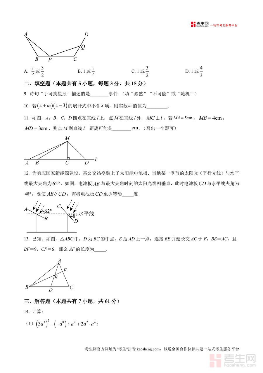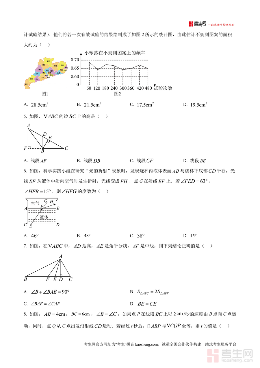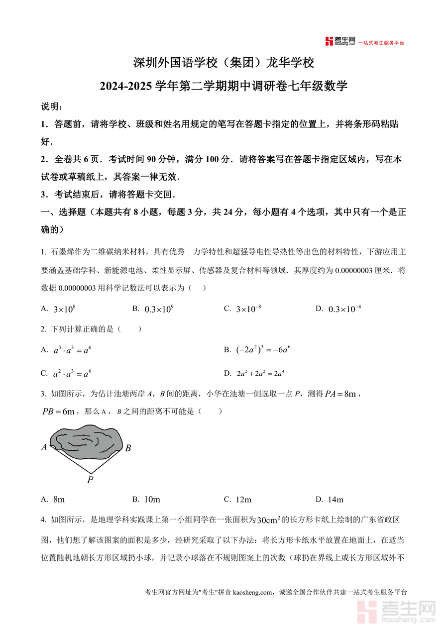 《精品解析:广东省深圳市龙华区深圳外国语学校(集团)龙华学校2024-2025学年下学期期中调研卷七年级数学(原卷版).docx》是一份针对该校七年级学生期中复习的权威备考资料,完整呈现了该校期中考试的试卷结构与命题风格。该试卷包含选择题8小题(共24分)、填空题5小题(共15分)及解答题7小题(共61分),覆盖科学记数法、整式运算、三角形高与中线、全等三角形判定、概率计算等核心知识点;题目设计融入石墨烯材料、新能源电池板、光的折射等实际情境,既考察基础概念又注重应用能力,体现该校数学教学的实践导向。
