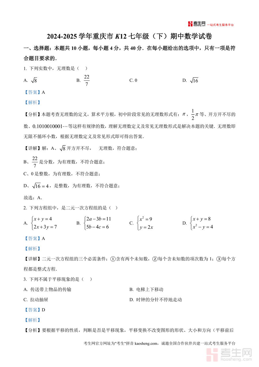 《精品解析:重庆市K122024-2025学年七年级下学期期中数学试卷(解析版)》是一份针对重庆地区七年级下学期数学期中备考的专业真题解析资料,涵盖选择题、填空题、解答题三大题型共24道题目,每道题均配备精准答案及详尽解析。资料特色在于严格贴合本地K12教学标准设计内容,解析部分不仅梳理无理数定义、二元一次方程组判定等核心考点,还融入解题思路引导与易错点警示,帮助使用者理解题目背后逻辑,强化对考点的深度掌握。