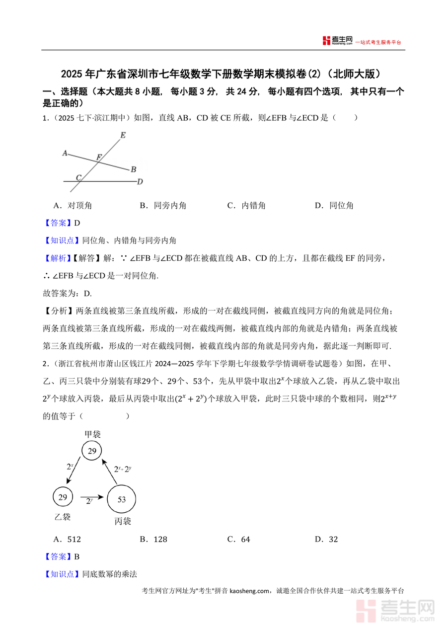 《2025年广东省深圳市七年级数学下册数学期末模拟卷(2)(北师大版)(解析).docx》是一份针对深圳地区七年级北师大版数学期末备考设计的专业资料。该资料包含完整模拟卷及详细解析,题型覆盖选择、填空、解答题三大类,题目精选自深圳各区及周边城市近年期中、月考真题改编,贴合本地考情。每份题目均标注核心知识点如“同位角判定”“完全平方公式应用”等,解析部分不仅给出答案,还详细拆解解题步骤、易错点提示及考点延伸拓展,为备考资料提供扎实的内容支撑。