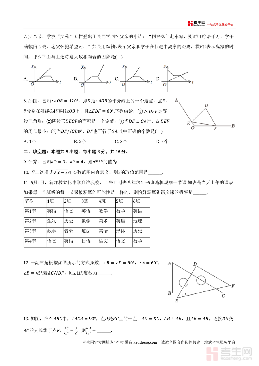 《广东省深圳市龙岗区百合外国语学校2024-2025学年七年级下学期期末数学试卷.docx》是一份由深圳知名民办初中百合外国语学校命题组精心编制,聚焦七年级下学期数学核心知识点的期末真题试卷。试卷包含选择题(24分)、填空题(15分)及解答题(61分)三大板块,覆盖代数运算(如二次根式化简求值)、几何图形(轴对称识别、尺规作图)、概率统计(成语事件类型判断)等核心模块,并融入校徽文化(清华北大校徽轴对称分析)、科技热点(纳米机器人科学记数法)、生活情境(父亲与学子离家距离函数图象)等多元素材,题型设计兼顾基础巩固与综合应用,体现名校命题特色。