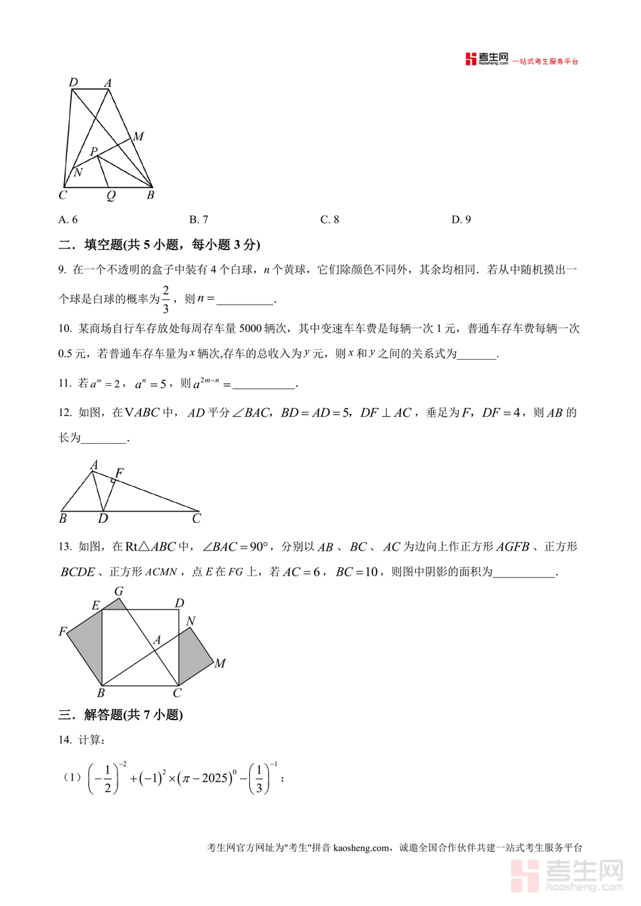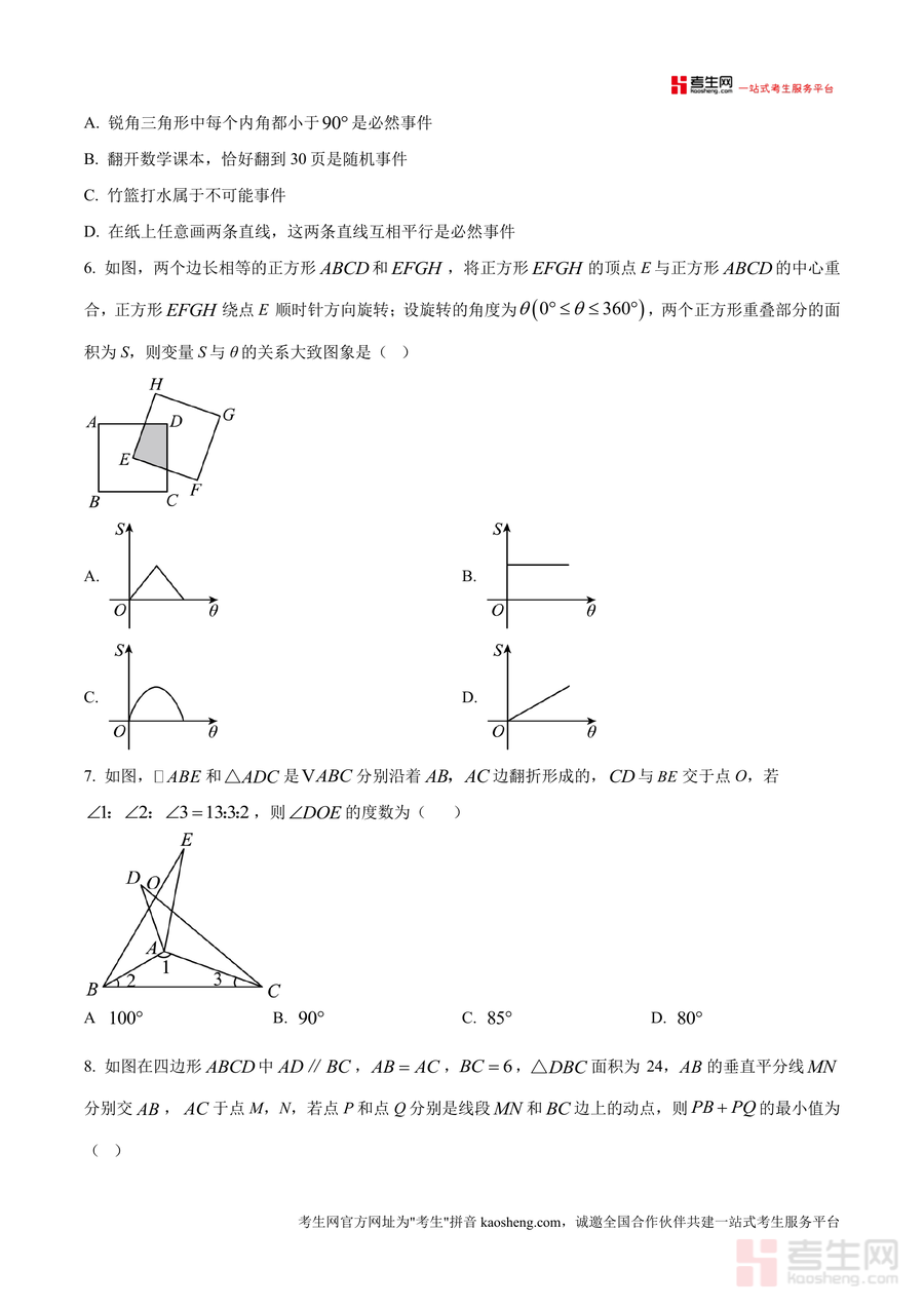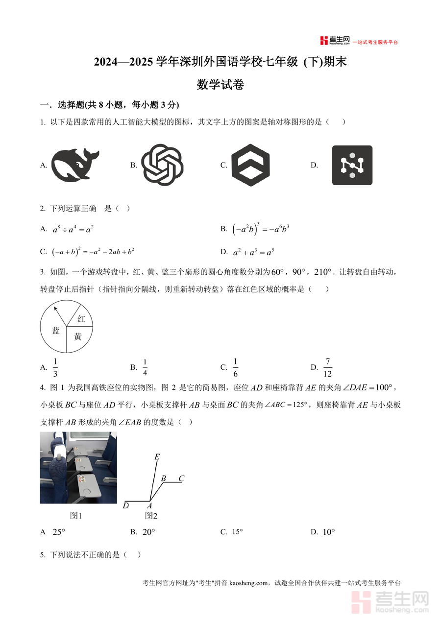 《精品解析:广东省深圳外国语学校2024-2025学年七年级下学期期末数学试题(原卷版).docx》是一份聚焦深圳外国语学校七年级下学期数学期末考要求、还原真题原貌的备考资料核心载体。其主要内容包含选择题8道、填空题5道、解答题7道共20道题目,覆盖轴对称图形判断、整式运算规则应用、概率计算、几何角度推导、事件类型分类、函数图像分析、翻折变换性质运用、最值问题求解等七年级下册数学核心知识点。特色亮点在于严格遵循该校期末考题型结构与难度梯度,保留真题的命题风格与考点分布特征,能让使用者直观感受名校考试对知识掌握程度与解题能力的要求。