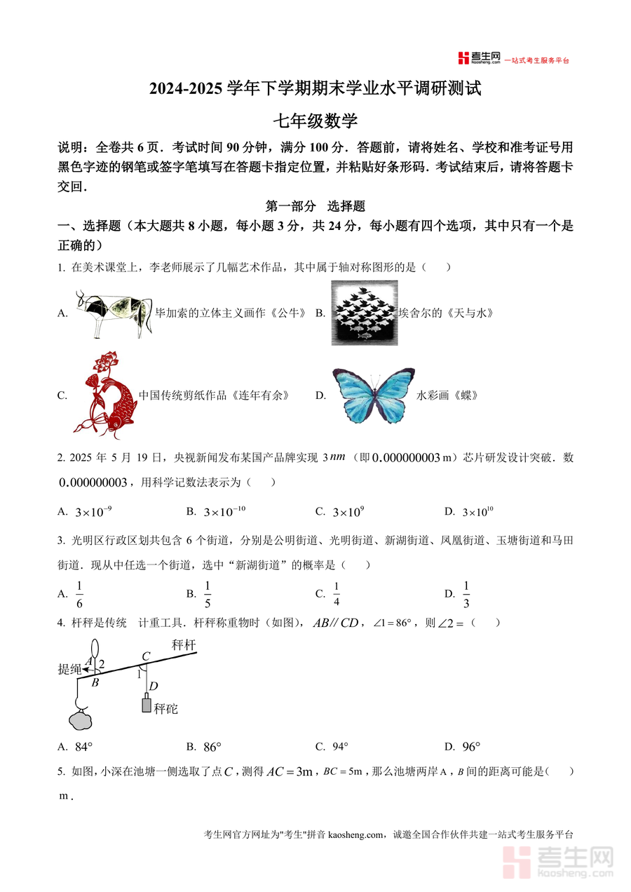 《精品解析:广东省深圳市光明区2024-2025学年七年级下学期期末考试数学试题(原卷版).docx》是一份针对区域期末学业水平调研的专业备考资料,完整呈现了光明区七年级下学期数学期末考的原卷内容与结构。文件包含8道选择题、5道填空题及7道解答题,覆盖轴对称图形识别、科学记数法应用、概率计算、三角形全等证明、函数关系分析等核心知识模块,且融入光明区地方特色元素(如光明乳鸽经济案例、无人机配送数据统计、光明区街道名称等),既贴合人教版七年级数学教材大纲,又体现区域命题的实践性与情境化特色。