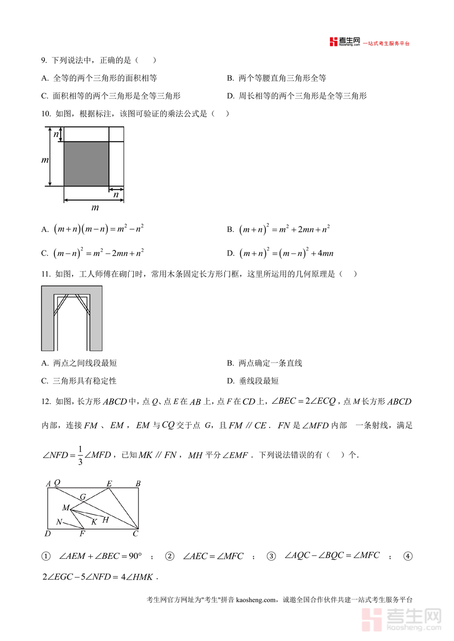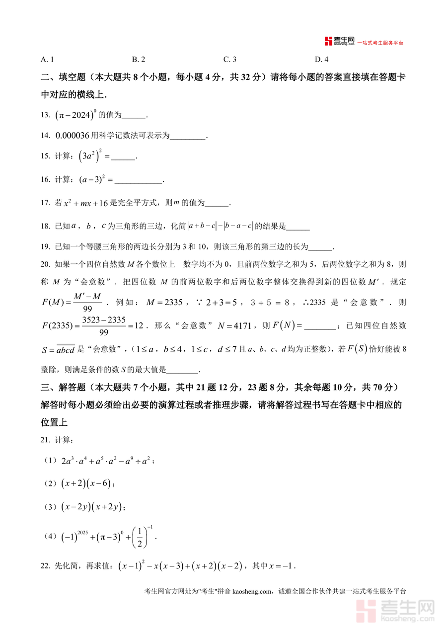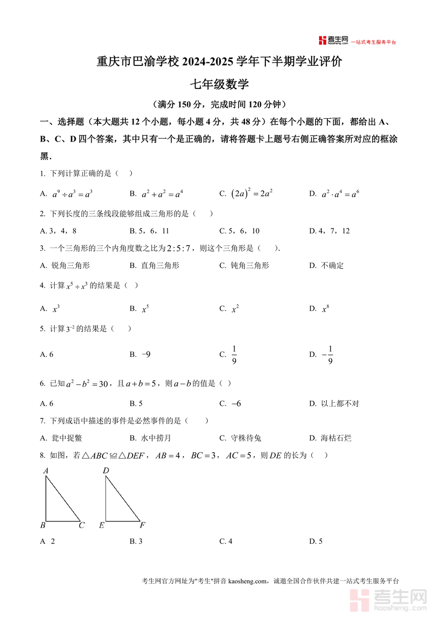 《精品解析:重庆市巴渝学校2024-2025学年七年级下学期期中考试数学试题(原卷版)》是一份针对重庆市巴渝学校七年级下学期期中数学考试的权威原卷资料。该资料完整呈现考试结构与题型分布:满分150分、时长120分钟;包含12道选择题(覆盖整式运算、三角形三边关系、全等三角形判定等核心考点)、8道填空题(涉及科学记数法、完全平方式、等腰三角形边长计算等内容)、7道解答题(含计算、化简求值、几何证明、统计分析及综合探究题)。其特色亮点在于严格遵循该校教学大纲与命题风格,题型设置贴合学生学习进度,为真题解析提供精准原始依据,助力使用者把握考试核心方向。