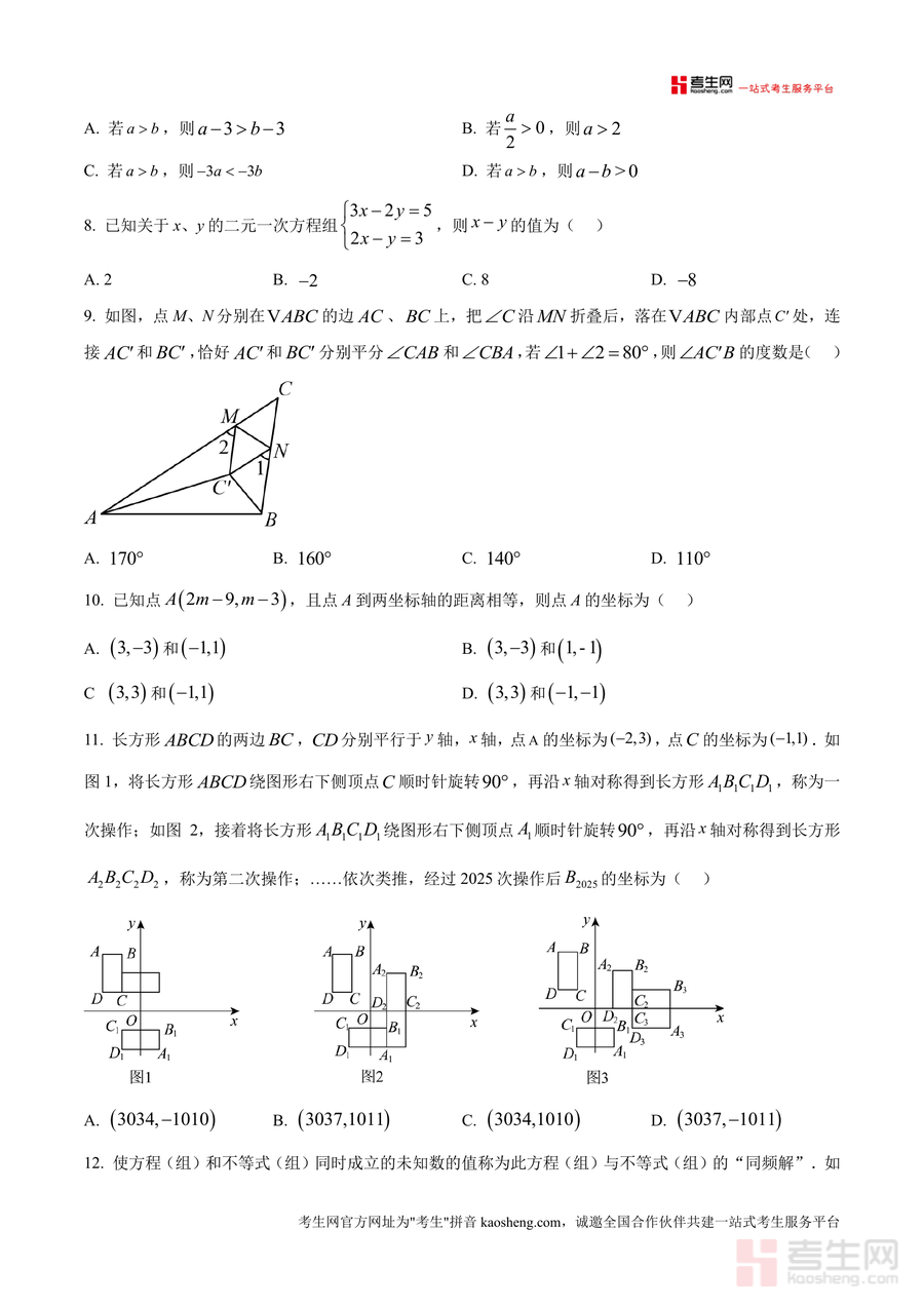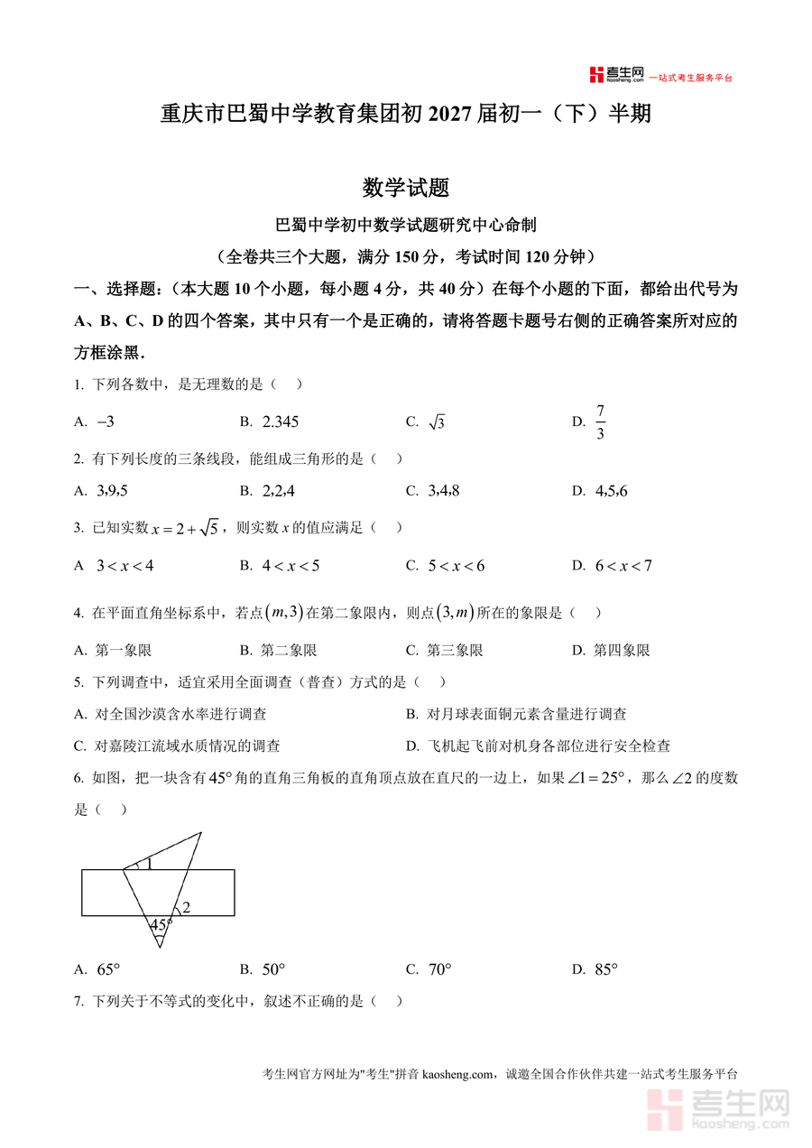 《精品解析:重庆市巴蜀中学2024-2025学年下学期期中考试七年级数学试题(原卷版).docx》是一份针对七年级下学期期中备考的权威真题资料,由巴蜀中学初中数学试题研究中心命制,全卷含选择(10题)、填空(8题)、解答(7题)三个大题,满分150分,考试时长120分钟。试题覆盖无理数识别、三角形构成条件、坐标系象限判断、不等式性质、二元一次方程组求解等七年级下册核心知识点,题型设置贴合重庆本地中考命题趋势,题目梯度合理,既考查基础概念的掌握,又兼顾逻辑推理与综合应用能力提升,能全面反映学生阶段性学习成果。