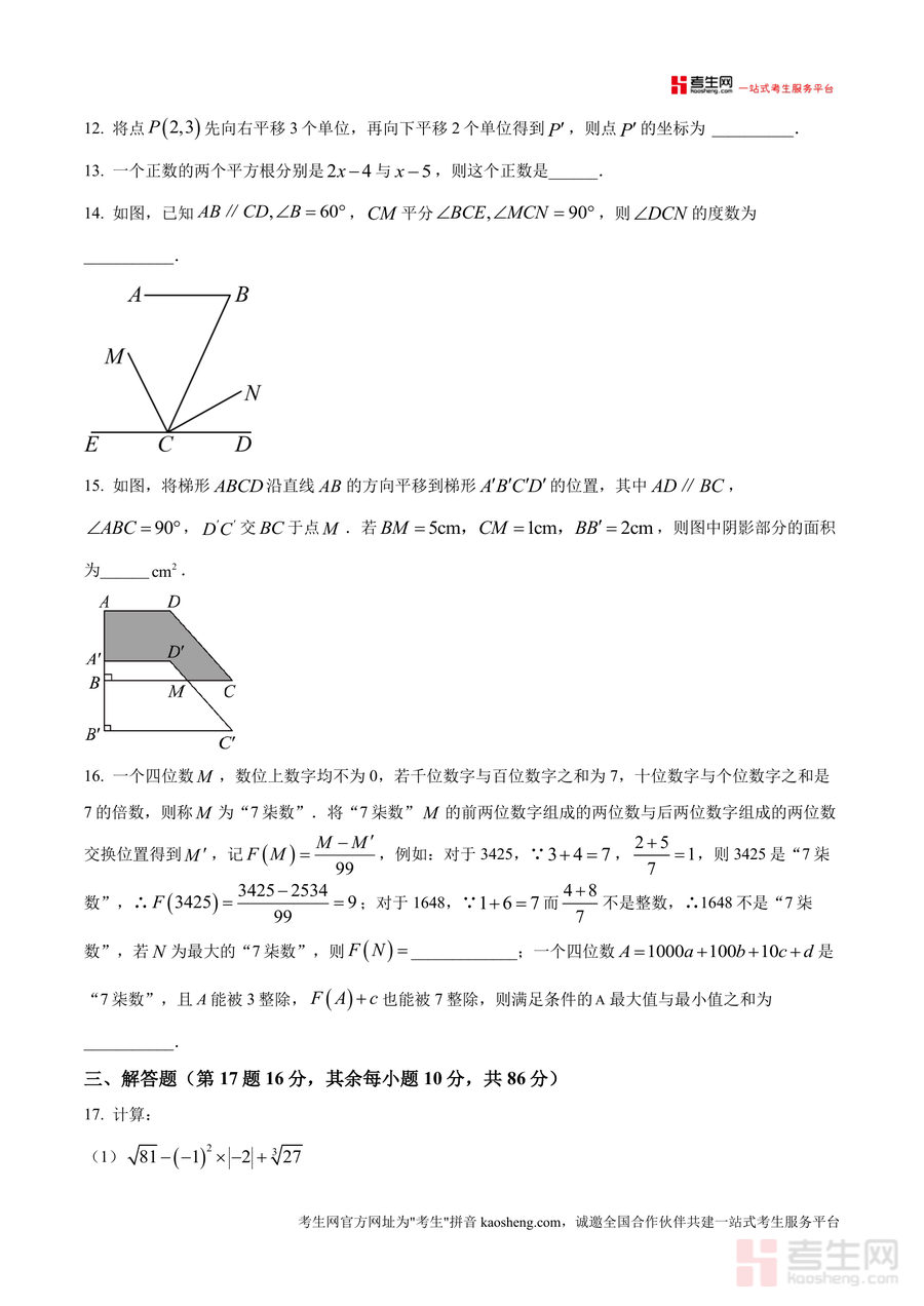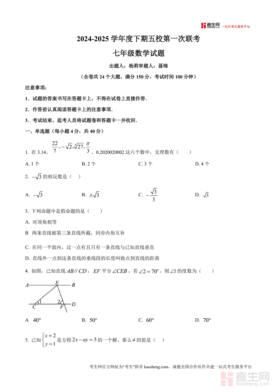 该资料核心用途为七年级学生期中备考的实战训练载体,适用于课堂模拟测试以熟悉考试流程与时间分配、课后自主练习以巩固知识体系、家长辅导时作为检测工具评估学习效果。其用户价值体现在通过完成原卷可帮助学生提升应试能力——精准把握联考命题规律,明确高频考点与易错点;备考优势在于作为五校联合命题的真题,相比普通练习更具针对性,能有效训练解题思路与答题规范,助力学生在期中考试中发挥最佳水平。