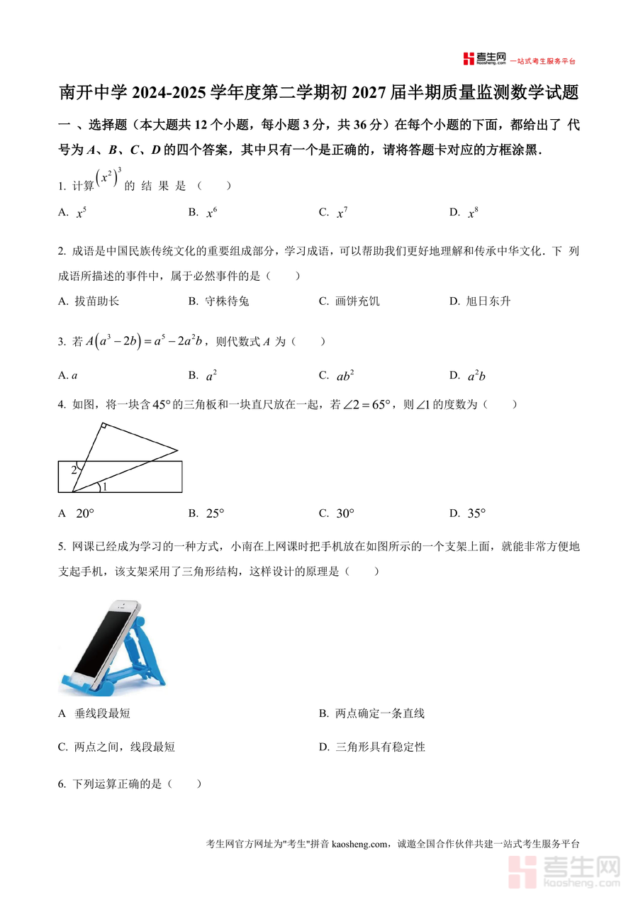 《精品解析:重庆市沙坪坝区重庆市南开中学校2024-2025学年七年级下学期4月期中数学试题(原卷版).docx》是一份针对七年级下学期数学期中阶段的权威备考资料与真题解析,完整呈现了南开中学初2027届半期质量监测的原卷内容。该资料包含选择题、填空题、计算题及解答题四大题型共46道题目(其中选择题12题、填空题12题、计算题3题、解答题5题),覆盖代数运算(如幂运算、完全平方公式推导)、几何图形(三角形稳定性判定、全等三角形证明)、概率统计(随机事件概率计算)等核心知识模块,其特色在于依托南开中学的教学优势与命题经验,试题设计贴合课标要求且具有一定区分度,能精准反映该校期中测试标高与命题方向。