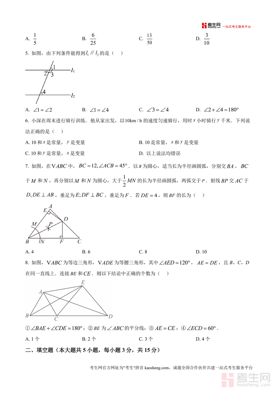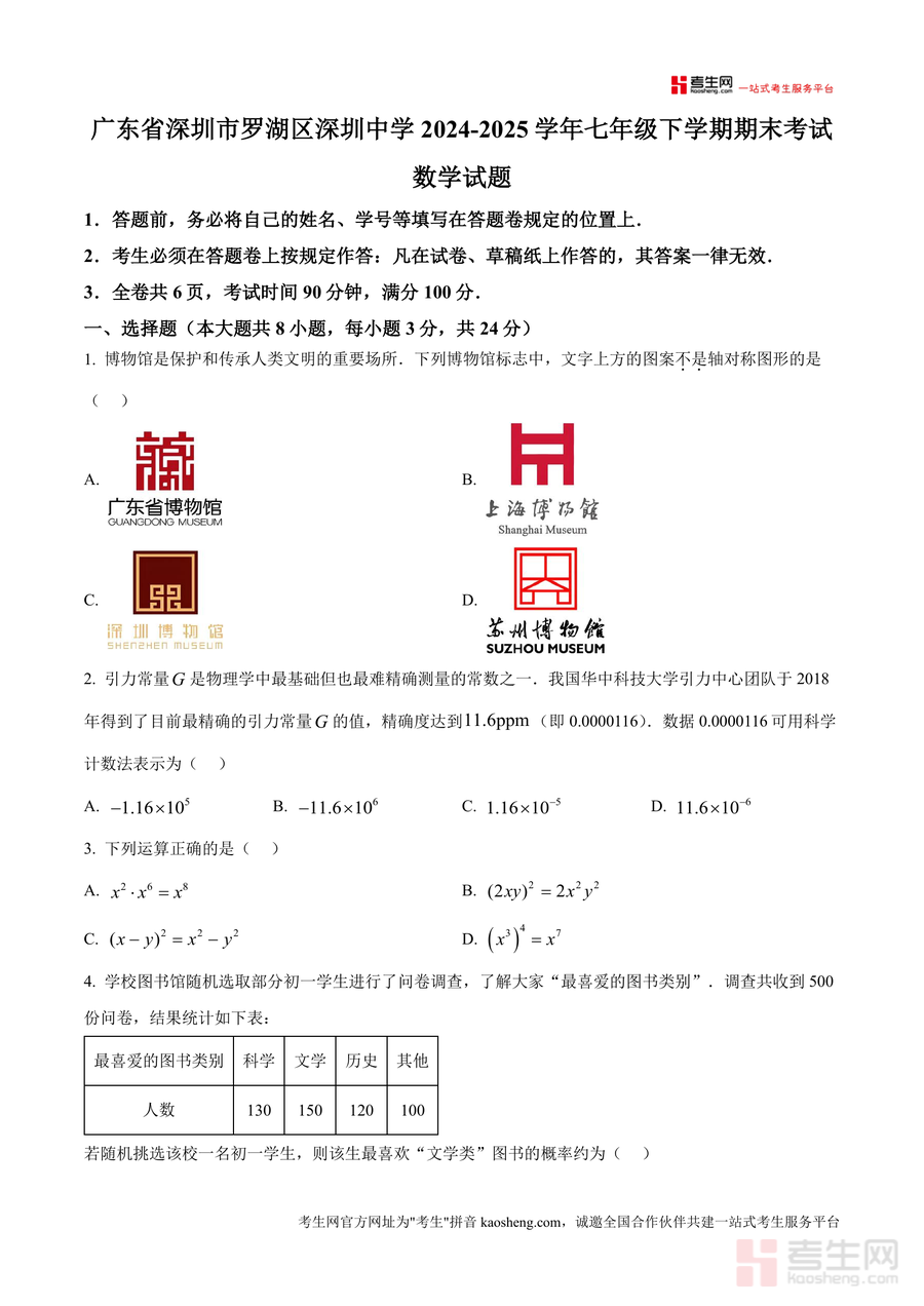 《精品解析:广东省深圳市罗湖区深圳中学2024-2025学年七年级下学期期末考试数学试题(原卷版).docx》是一份针对深圳市罗湖区深圳中学七年级下学期数学期末考的权威真题资料。内容涵盖选择题(8小题)、填空题(5小题)及解答题(7小题)三大模块,题型覆盖轴对称图形判断、科学计数法表示、代数运算正误辨析、概率计算、几何位置关系证明、函数变量分析等七年级下册核心知识点,并包含项目式学习与综合实践类探究题。其特色在于严格贴合深圳中学教学进度与罗湖区期末考纲要求,题目设计兼具基础性与综合性,能全面反映该阶段数学学习的重点与难点。