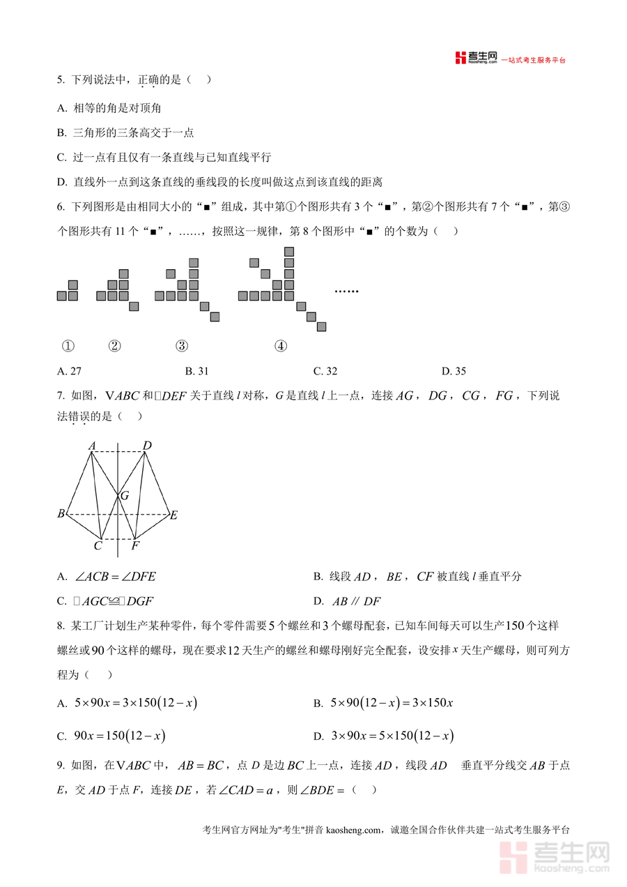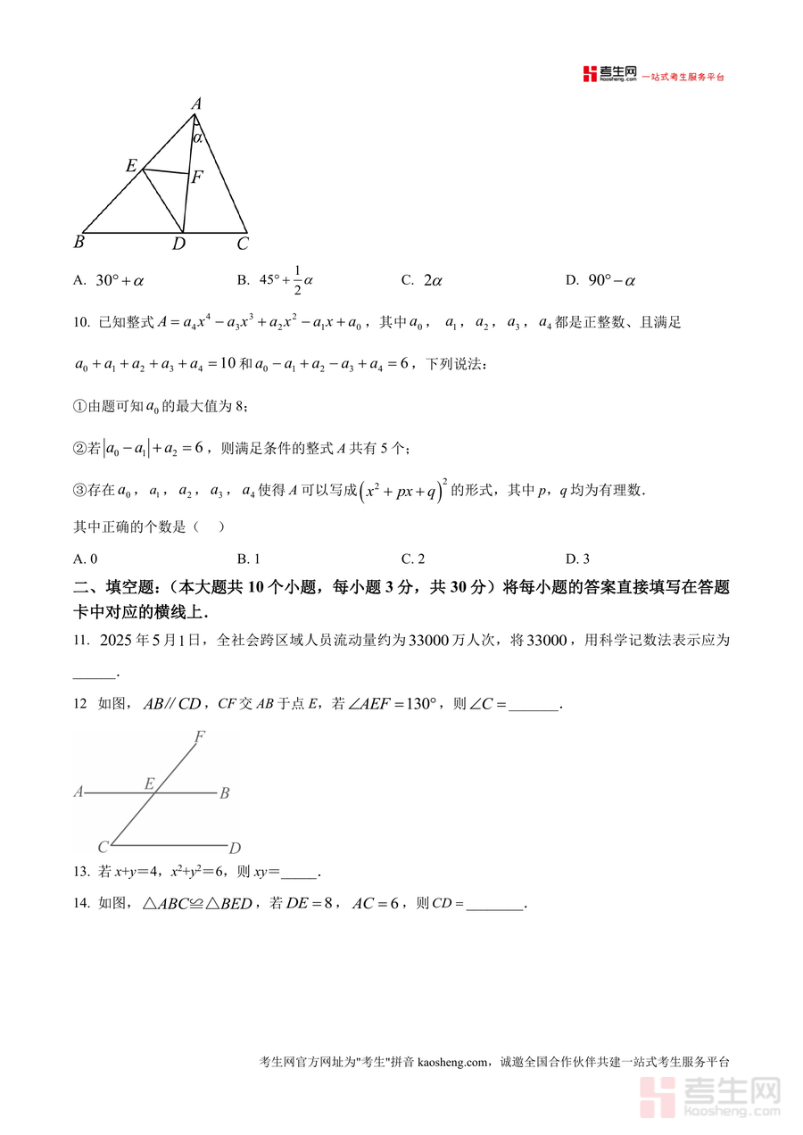 《精品解析:重庆市第一中学2024-2025学年下学期七年级期中考试数学试题(原卷版).docx》是一份针对七年级下学期期中数学备考设计的权威真题资料,涵盖全卷三个大题共150分、考试时长120分钟的完整试卷结构。内容包含选择题(10小题30分)、填空题(10小题30分)及解答题(8小题90分)三大题型板块,覆盖轴对称图形判定、三角形三边关系与全等判定、必然事件识别、整式运算与方程应用、概率计算、几何证明等核心知识点,解答题包含计算类、尺规作图类、证明类及应用题等多元题型,体现重庆一中贴合本地教学进度与考纲要求的命题特色,是七年级数学期中备考资料中的优质真题资源。