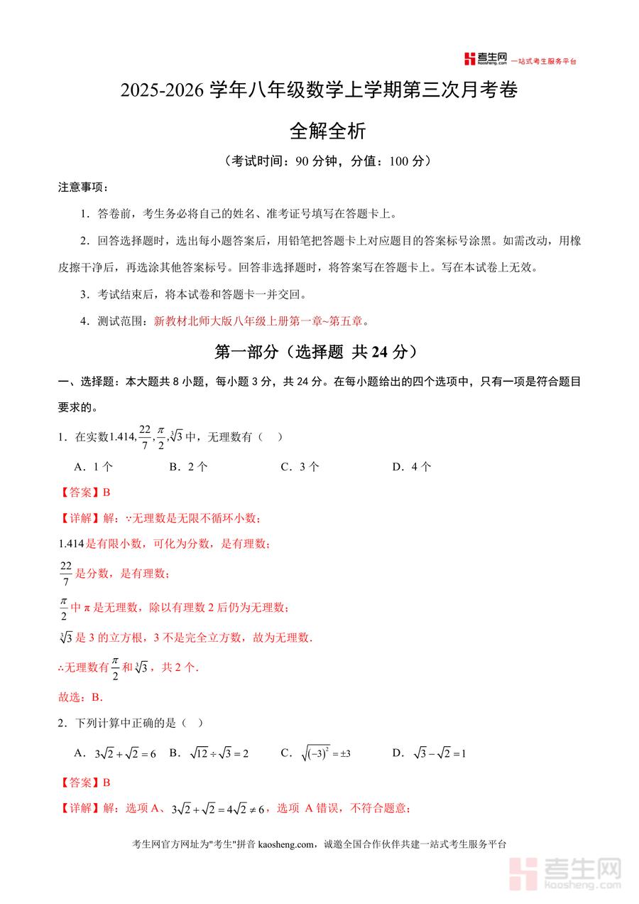 本资料适用于深圳地区使用北师大版八年级上册数学教材的学生、数学教师及学生家长。作为贴合本地教学进度与考试要求的专业资料,其不可替代性在于全题型覆盖与详细解析结合,能满足不同使用者需求;长期价值体现在帮助学生系统巩固基础知识点,形成规范解题思维,为后续数学学习奠定扎实基础。