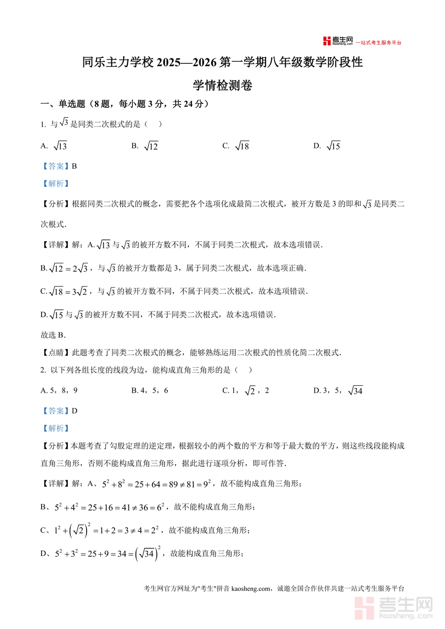 《精品解析:广东省深圳市龙岗区龙岗街道同乐主力学校2025-2026学年八年级上学期第一次月考数学试题(解析版)》是一份针对该校八年级上学期第一次阶段性学情检测设计的真题解析资料,聚焦初中数学核心知识模块,涵盖单选题、填空题及解答题等完整题型结构,每道题目均配备考点分析、步骤拆解及易错点睛内容。其特色亮点在于深度贴合该校教学进度与考纲要求,通过真题解析帮助使用者精准把握同类二次根式判断、勾股定理逆定理应用、一次函数定义等高频考点,将备考资料价值与实际教学场景紧密结合。