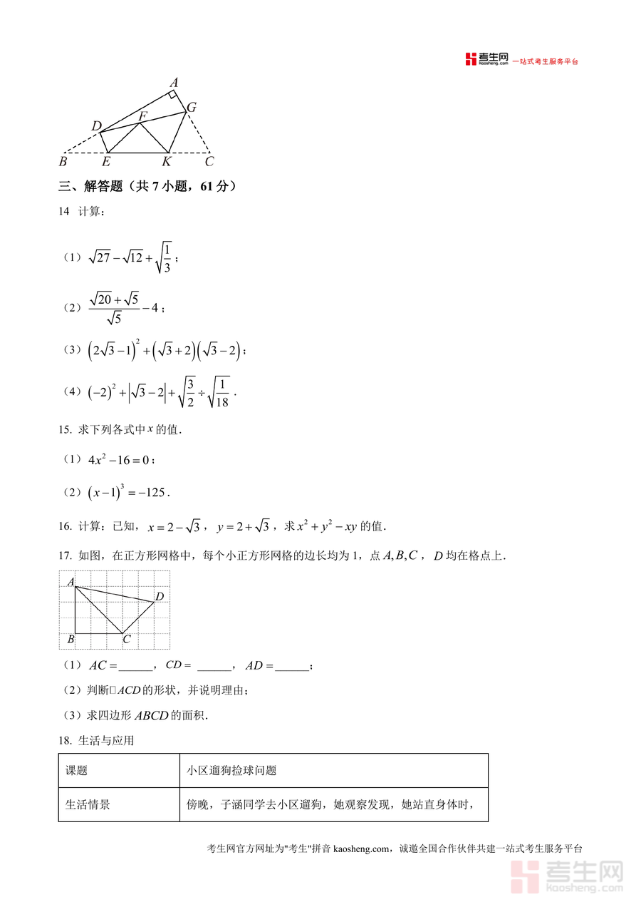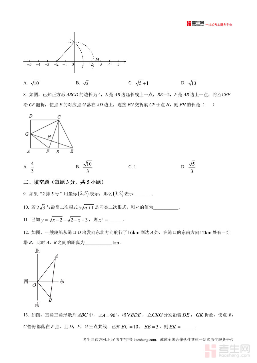 《精品解析:广东省深圳宝安区富源中学2025-2026学年上学期10月月考八年级数学试卷(原卷版).docx》是一份针对深圳宝安区富源中学八年级学生的阶段性数学备考资料,聚焦该学年上学期10月学情调研需求。文件包含完整原卷内容,涵盖选择题(8题)、填空题(5题)、解答题(7题)三大题型,覆盖无理数识别、二次根式运算、勾股定理应用、网格作图分析等八年级上册核心知识点。其特色亮点在于贴合深圳本地教学进度与考纲要求,题型设计兼顾基础巩固与能力拓展——如结合圆柱侧面最短路径问题考查空间想象能力、通过换元法与分母有理化题目渗透数学思想方法,同时融入实际应用场景(轮船航行距离计算),全面呼应应试能力培养需求。